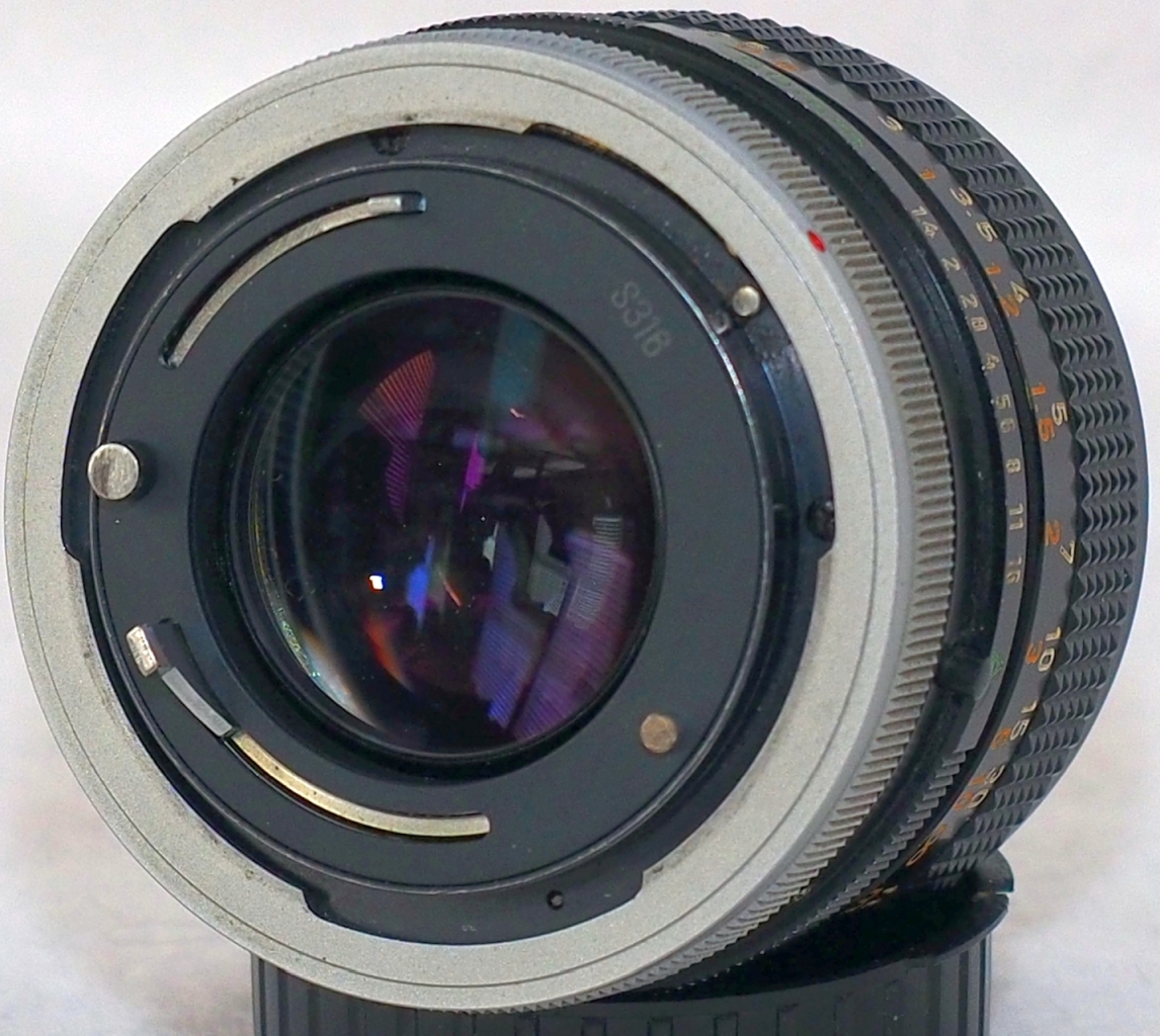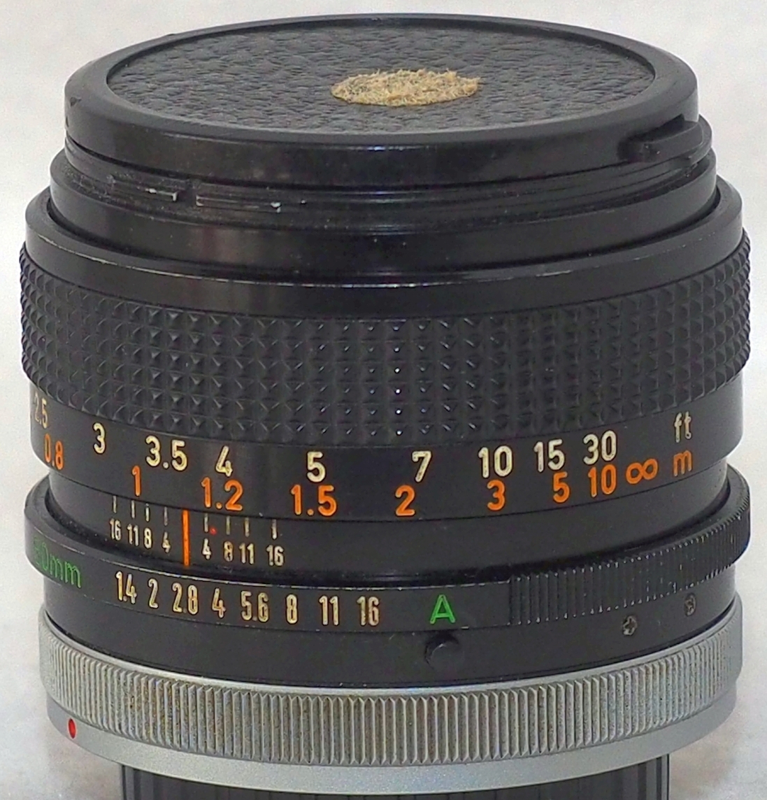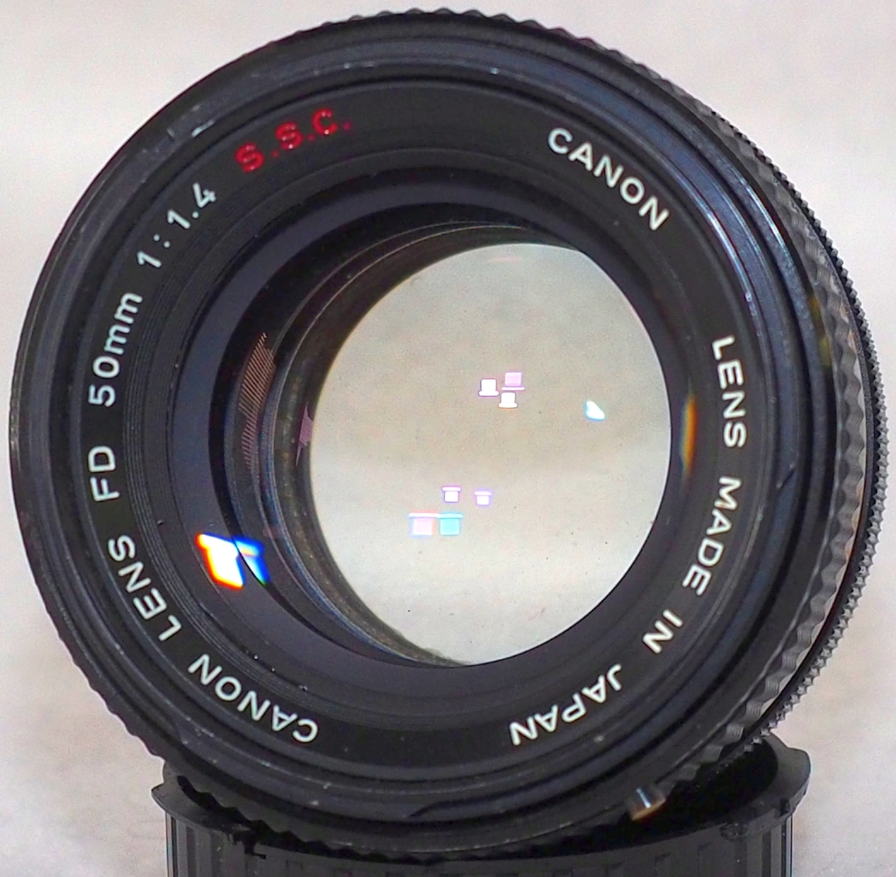 Canon nFD 50/1.8, the nifty fifty. Good physical condition with clean/clear glass other than some internal dust. No scratches, haze, or other flaws I can see.