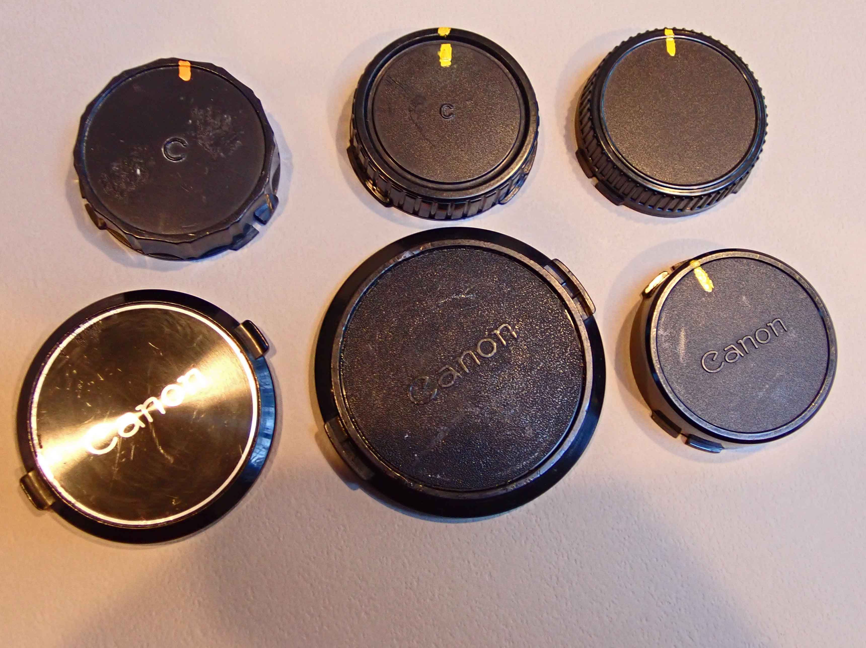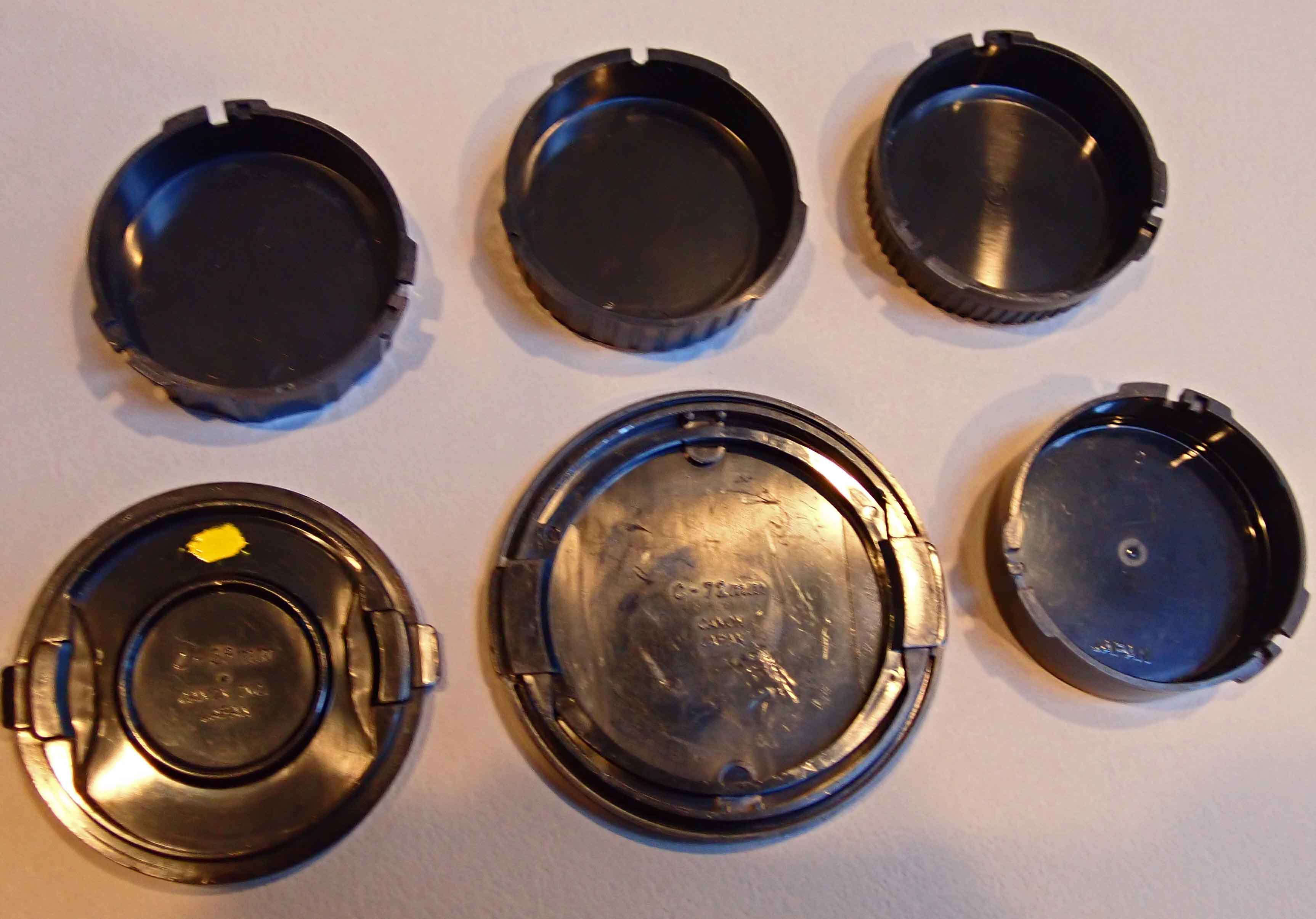 Two Canon front lens caps, 58 and 72 mm plus four rear lens caps, 1 Canon and 3 after market to fit Canon Fd lenses. All used, in good condition.​
