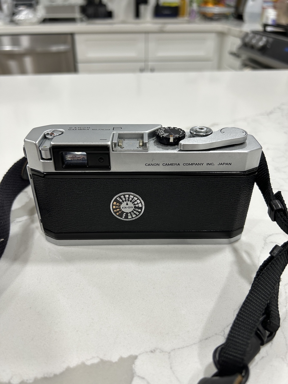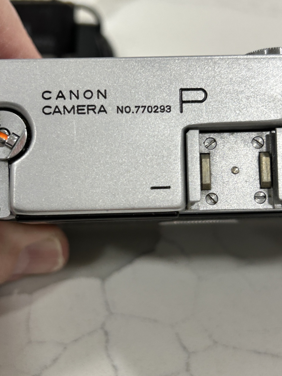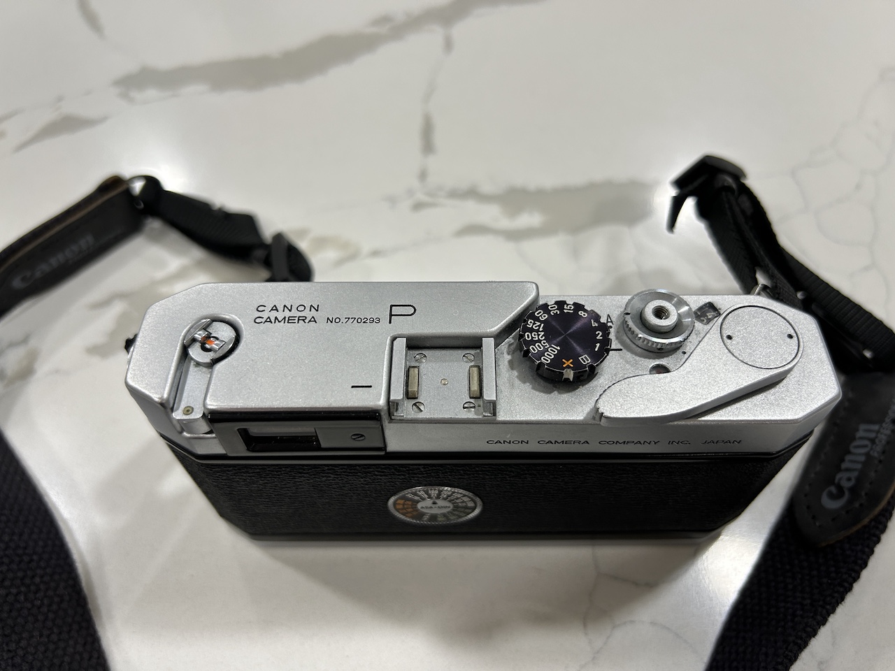 I am selling a beautiful Canon P Leica thread mount rangefinder body. The cosmetic condition is excellent and the camera has seen very little use. The shutter speeds, finder, and mechanisms are all fine. The metal shutter curtains are clean and smooth. The rangefinder patch is bright, but very slightly off in the vertical direction and at infinity. The intermediate distances seem quite accurate. None of this has any significant impact on use. The rangefinder calibration is also user adjustable (if you have some fine jeweler screw drivers), but I'd rather leave that up to the new owner as I don't trust my own skill level to do this.