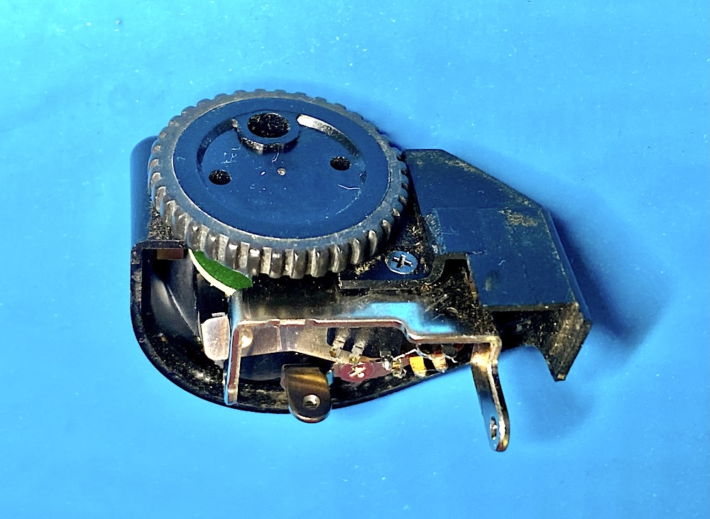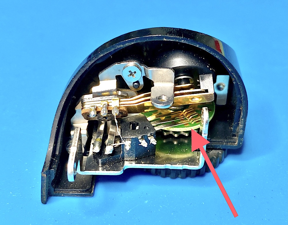 I have just found a note from Thomas Tomosy (Camera Maintenance & Repair, Book 1) on how to lift the trigger switch assembly without damaging the cable connections. Then the contacts on the adjustment wheel can be cleaned.