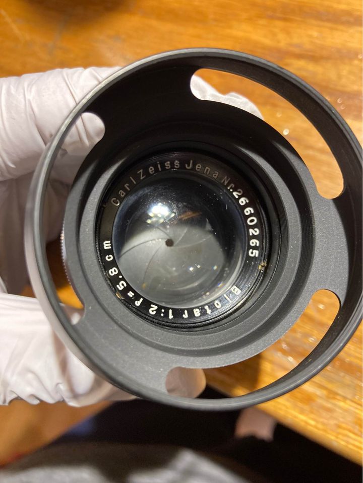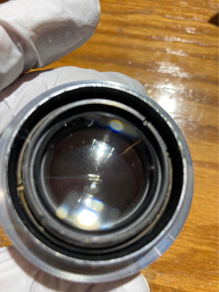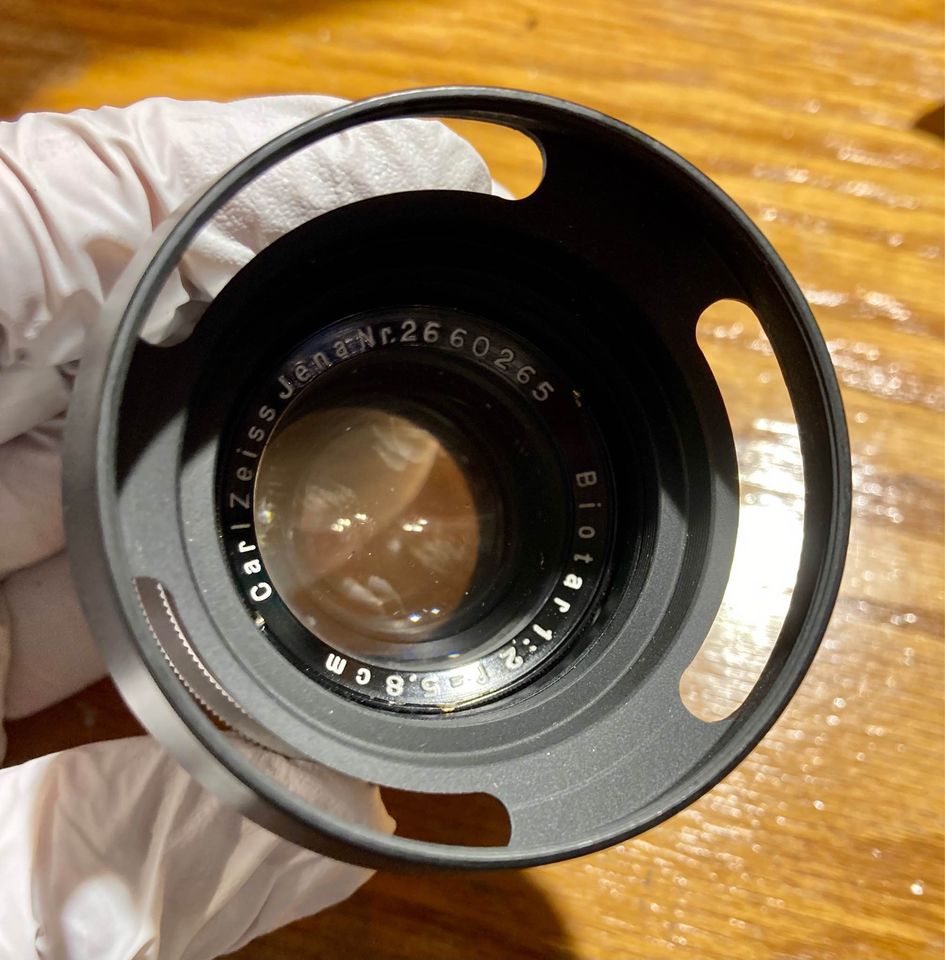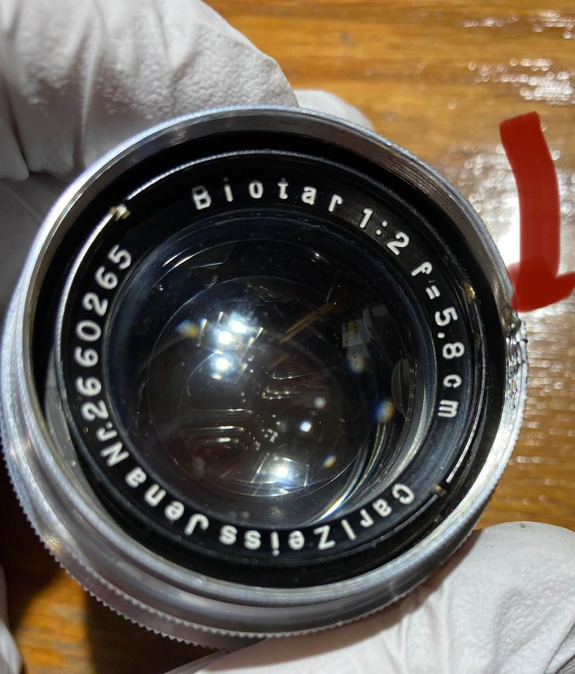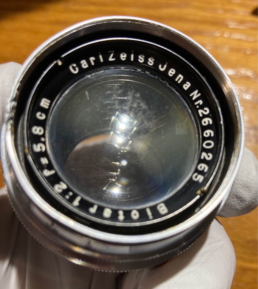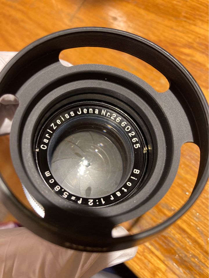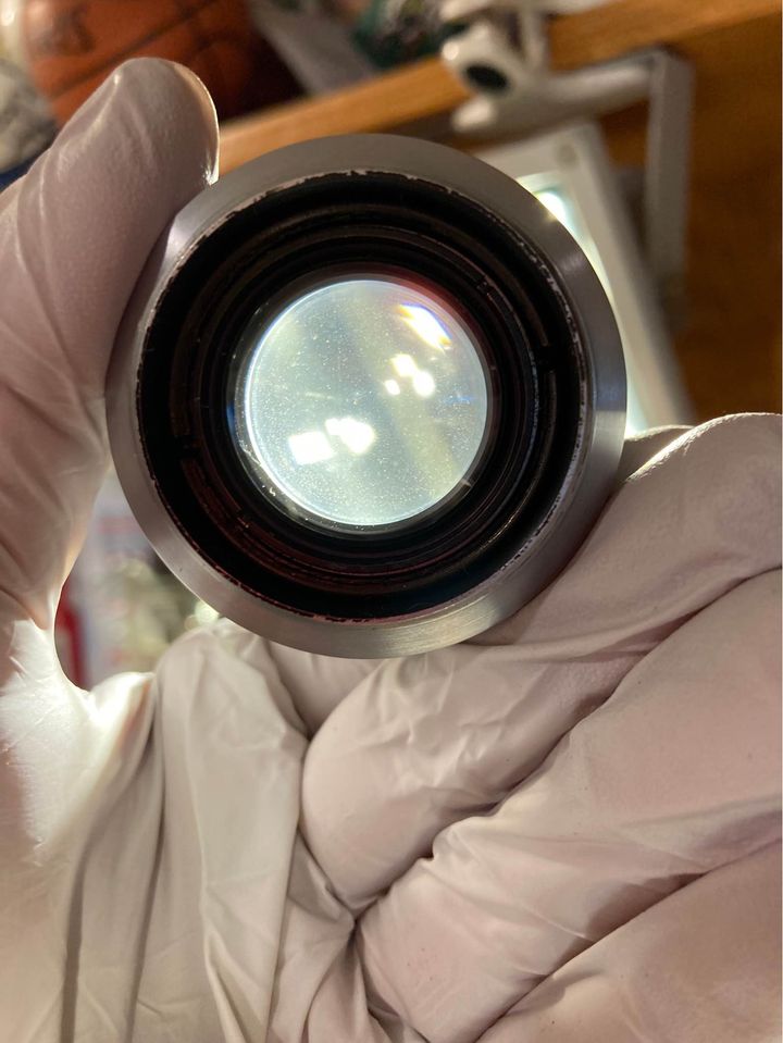 This is the pre-war Biotar version made in heavy brass. Lens was recently cleaned by Bill Moritz. Glass still has some very light residual haze/spotting inside, although Bill thinks its some coating damage...in any event glass is in relatively clean and clear condition and shoots well. Some scuffs on the glass too. See sample pics.. Glass grades an 8-.. See the pics where the lens is getting direct 300 watts of light into it - a torture test!!