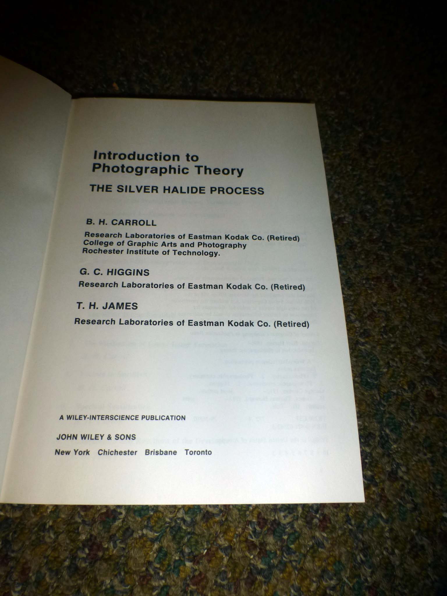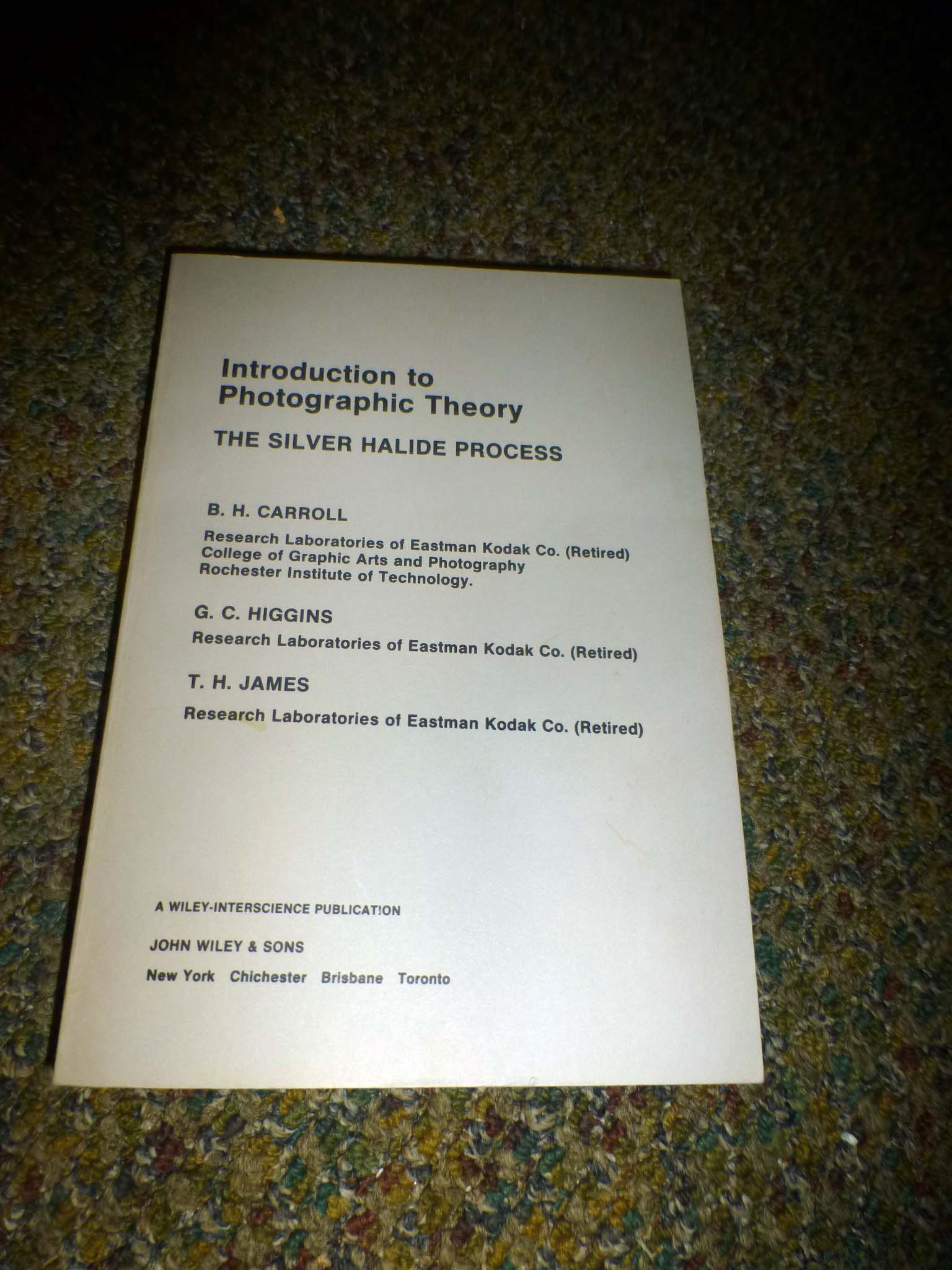 Carrol, Higgins, and James, Introduction to Photographic Theory, Published by John Wiley, ©1986. This is the easy to understand version. It was the basic text for RIT photo science freshman and Kodak newly hired engineers and researchers. Paperback. Like new 356 pages.