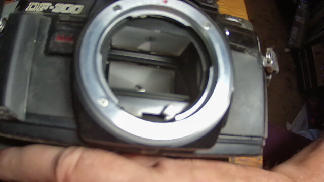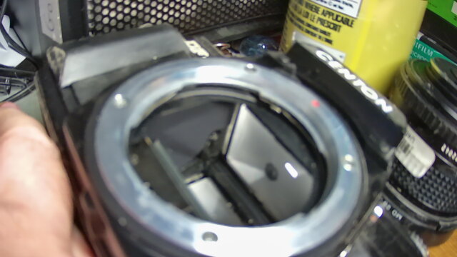I bought new batteries (DL1/3N) but I'm still seeing nothing through the viewfinder, just pure black. Having taken the lens off, it seems the mirror is stuck upwards and I was hoping the new batteries would hold the power to jolt it back down. Alas, no.