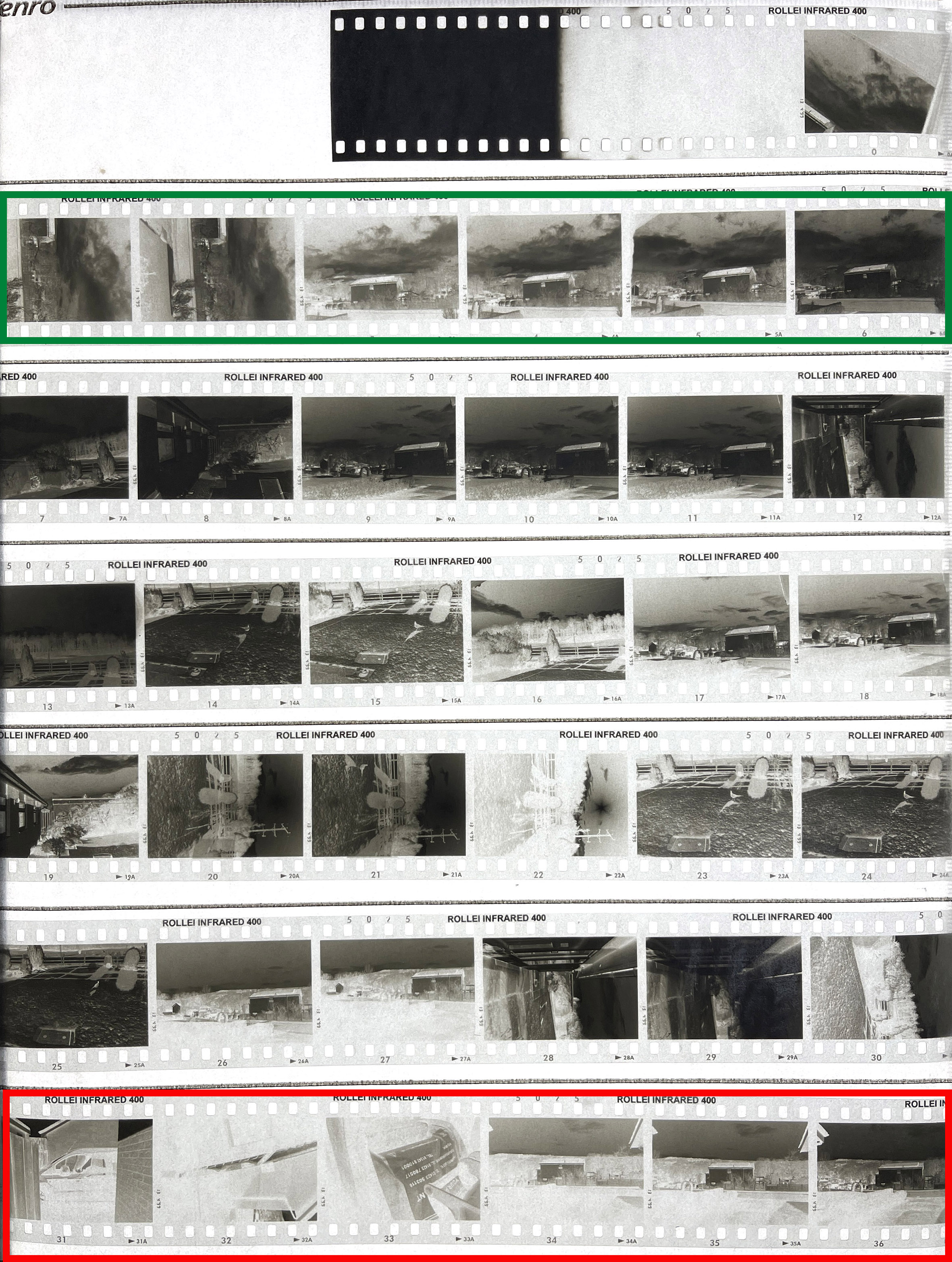 Here's a quick iPhone shot of the roll. Having had a bit more time to analyse it, the first strip (highlighted green) seems to be not too bad. These were spot metered, using the in camera spot meter through the IR72 filter. The 3 shots to the right, were bracketed at 0, +1 and +2 stops. The last strip (highlighted red) was without filter and spot metering from a mid grey area. The 3 shots to the right were again 0, +1 and +2