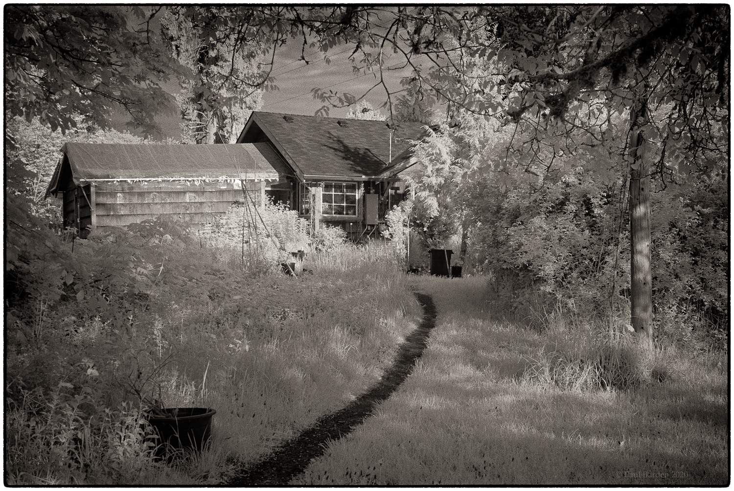 Part of the deal with getting good results is about exposure: bracket in half stops as much as 2 (or even 3) full stops over what you meter. This film can handle density as long as you develop it appropriately (AVOID Rodinal!). Another factor is selecting light conditions that work well. The scene in the photo was quite contrasty: mid-morning light streaming across the yard, light haze over the sun. The IR spectrum reveals more penetration into shadow areas than you might expect. Third, the use of an opaque IR filter like the Hoya R72 will be a huge asset. The tonality of the resulting images will be about as close as you can get to HIE as modern films can take you.