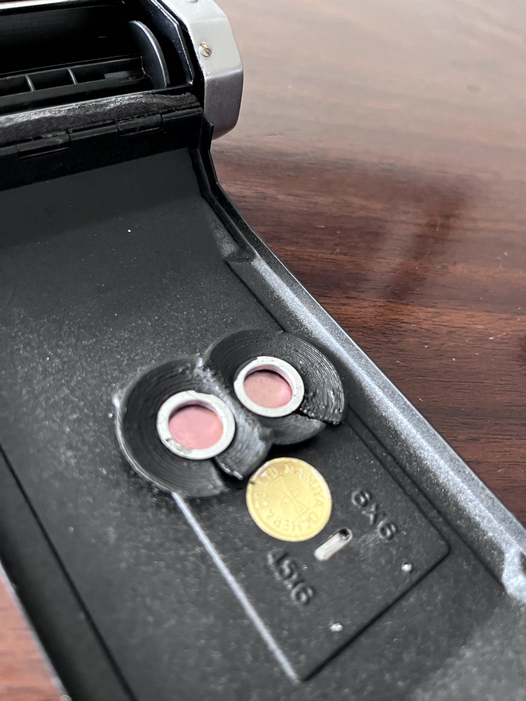 - The knob is missing for the switching of indicator windows, so you do it with a needle from the inside of film door