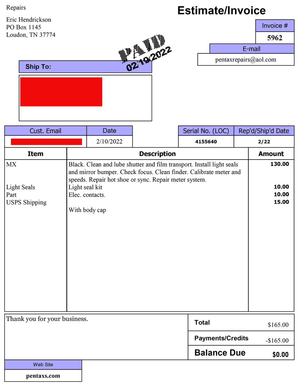 I bought this a few months ago, it was previously serviced by Eric Hendrickson (pentaxs.com).