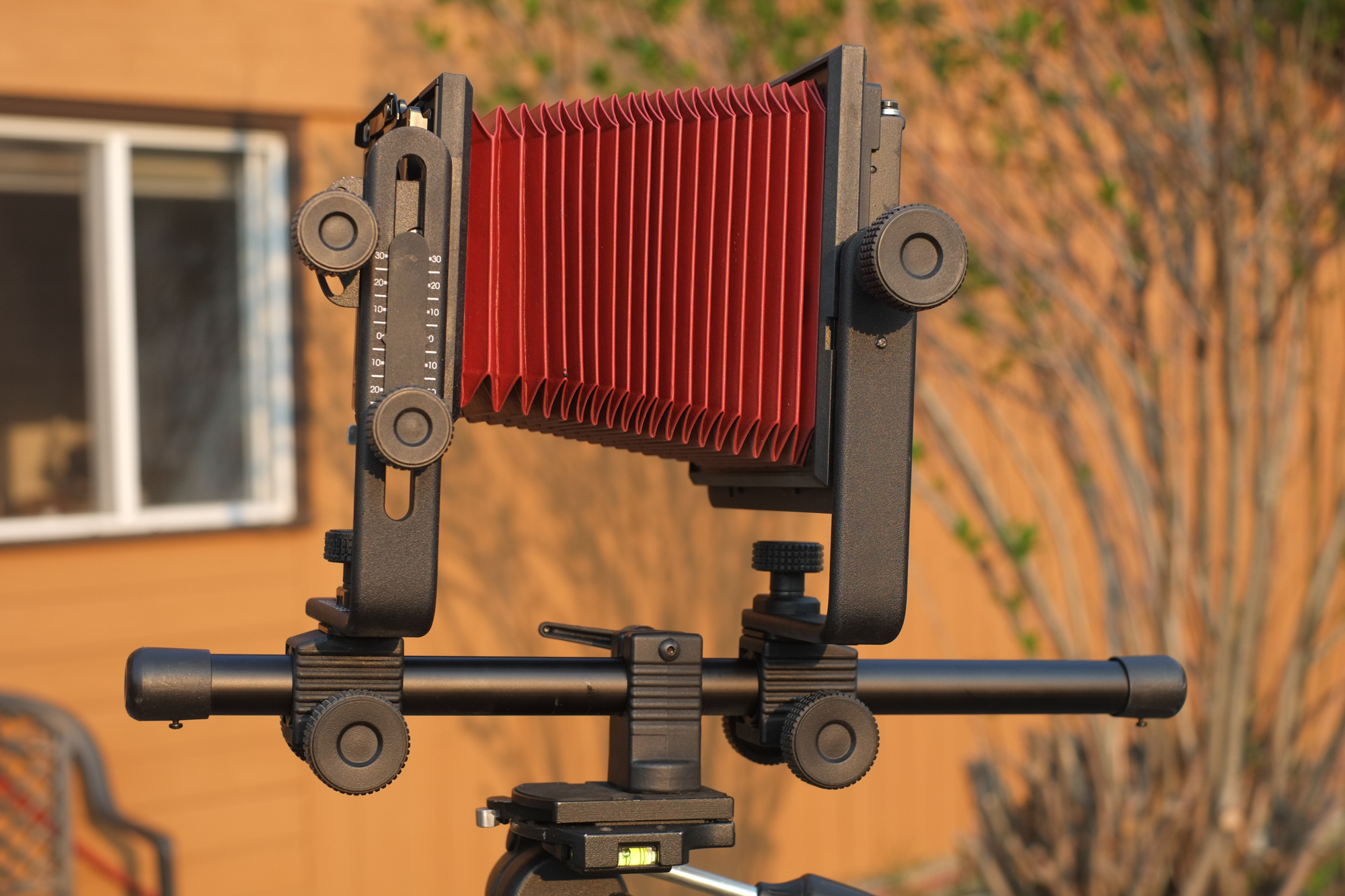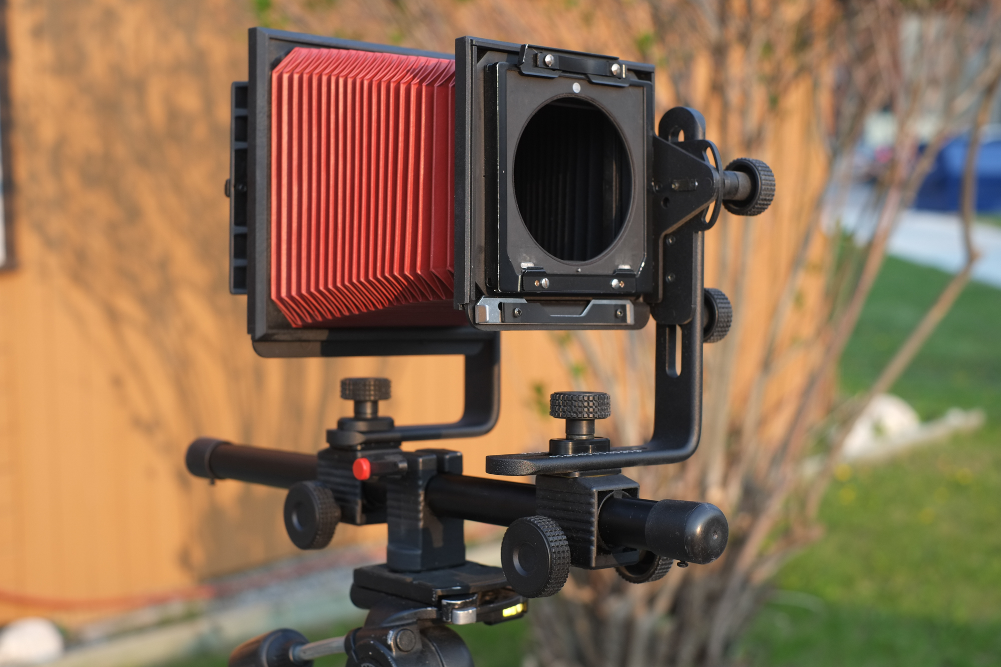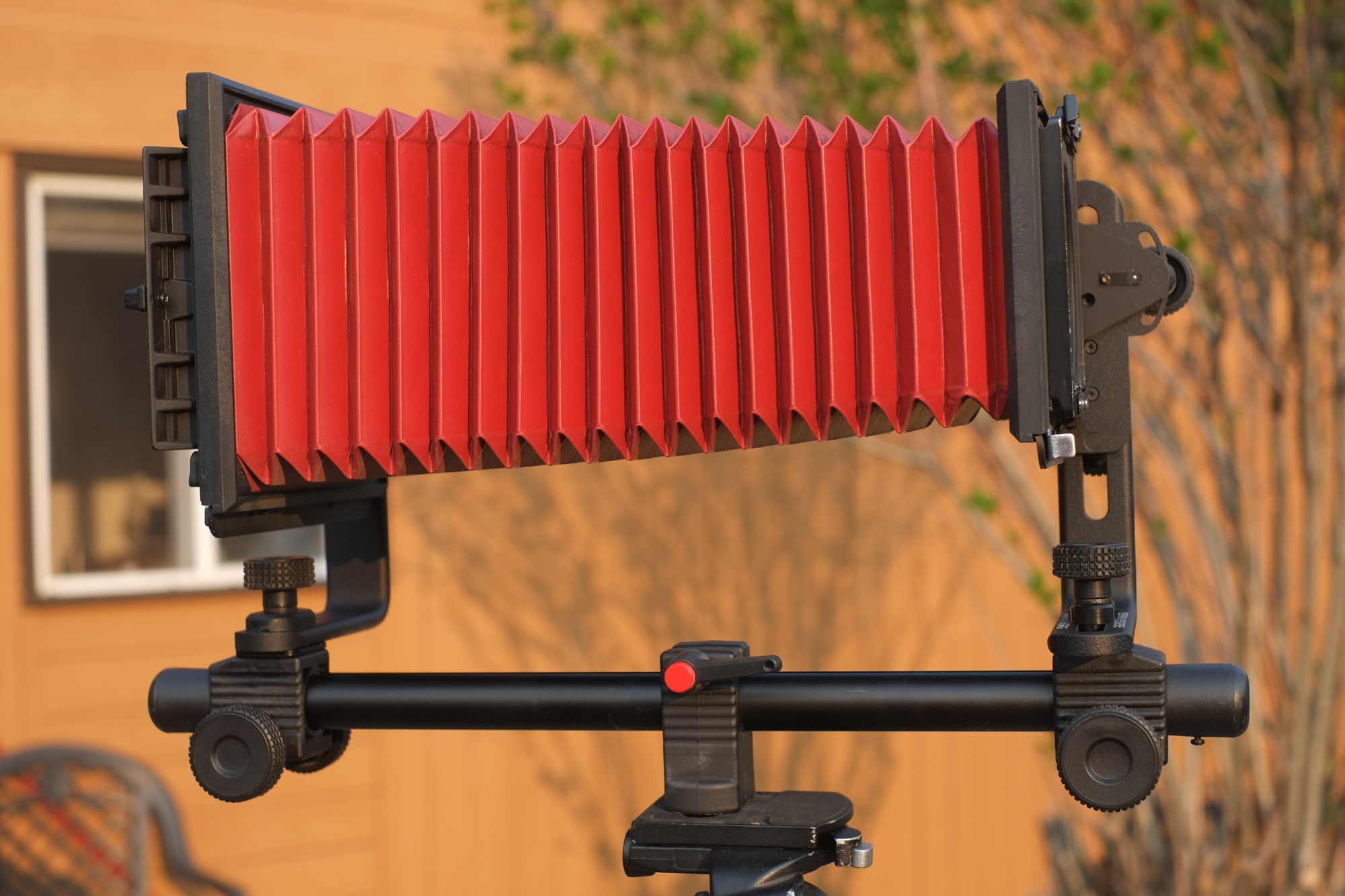For sale: Calumet Cadet Monorail 4x5 camera.... with Linhof Technika adapter board. Great little camera with flashy red bellows. Cool thing is that with 15" rail it will (just) accommodate my Nikon TELE ED 360mm and 500mm lens for sale in another listing here.