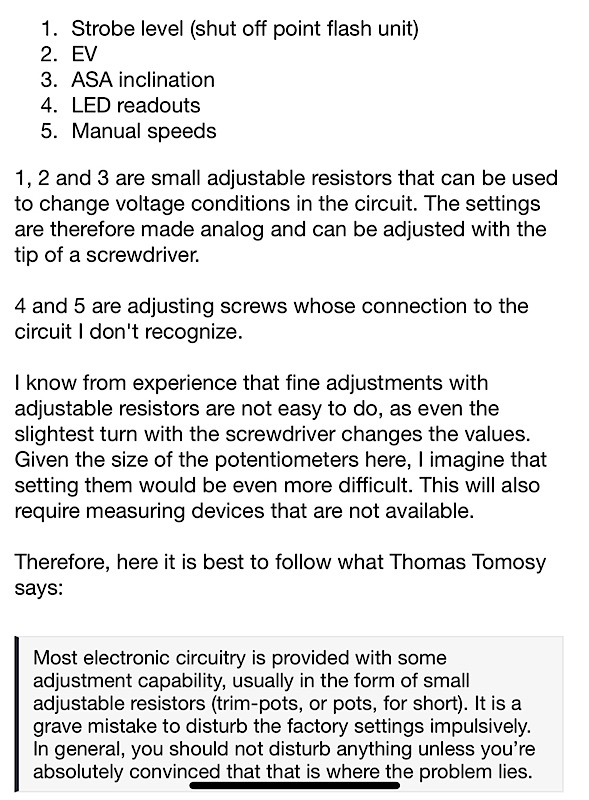 The latter mostly involves voltage settings via potentiometers. This is how the correct values for individual exposure times, automatic, ASA, LED displays or voltage gradations are set, as the electronics are still mostly analogue.