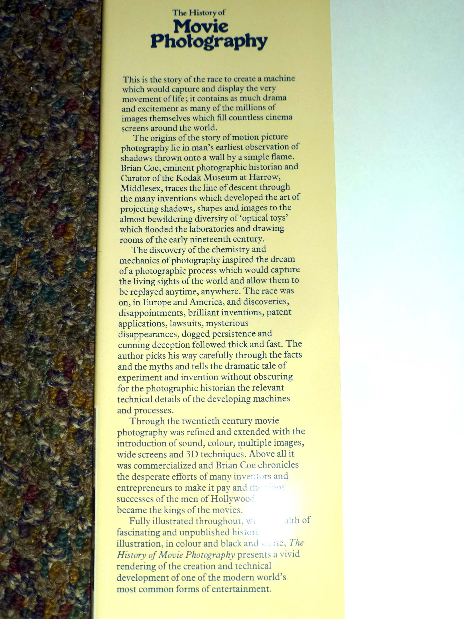 Brian Coe, The History of Movie Photography, ©1981, 176 pages like new with mint dust jacket. Mr. Coe was the curator of the Kodak Museum in Harrow England. He had the resources, knowledge, and skill needed to write and excellent book on the subject. 176 pages, hard cover out-of-print.