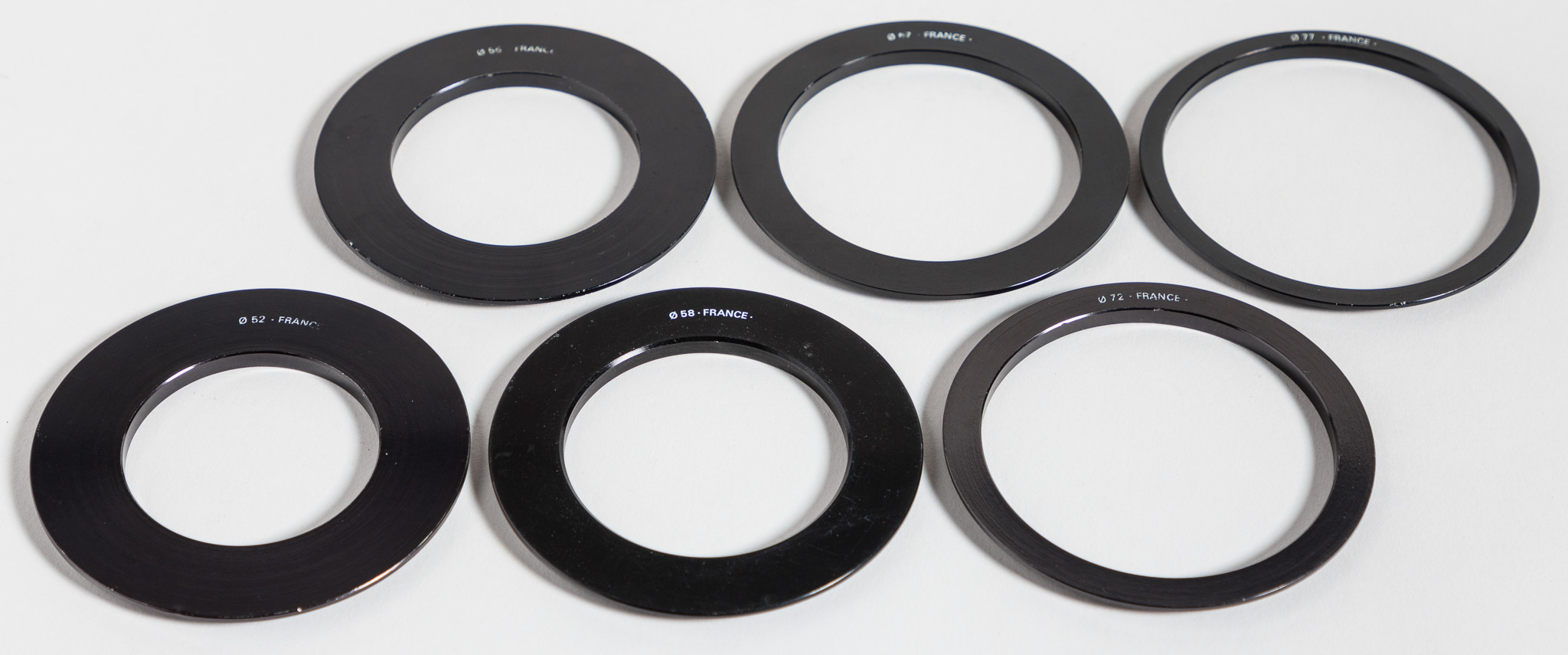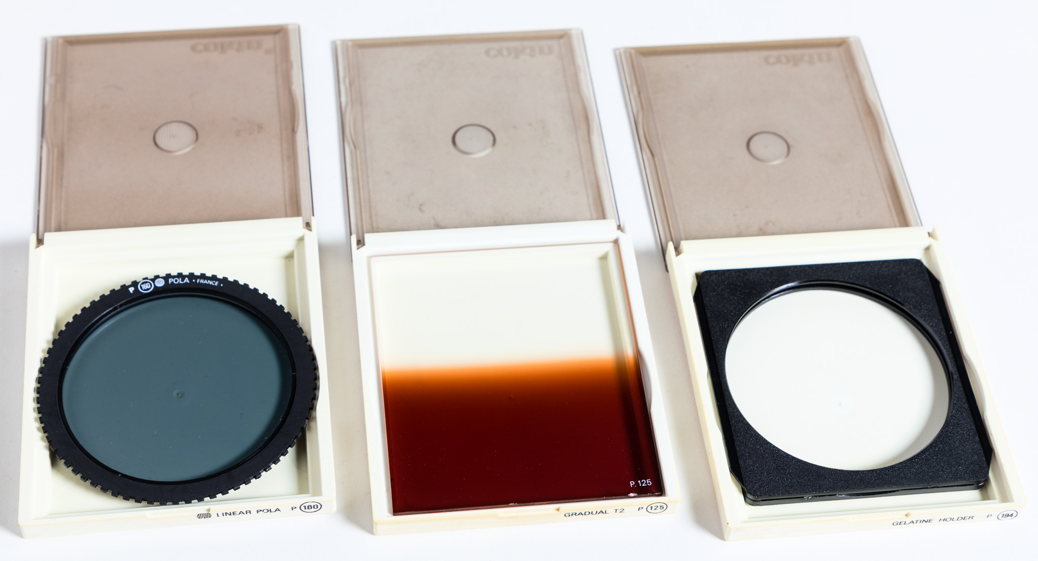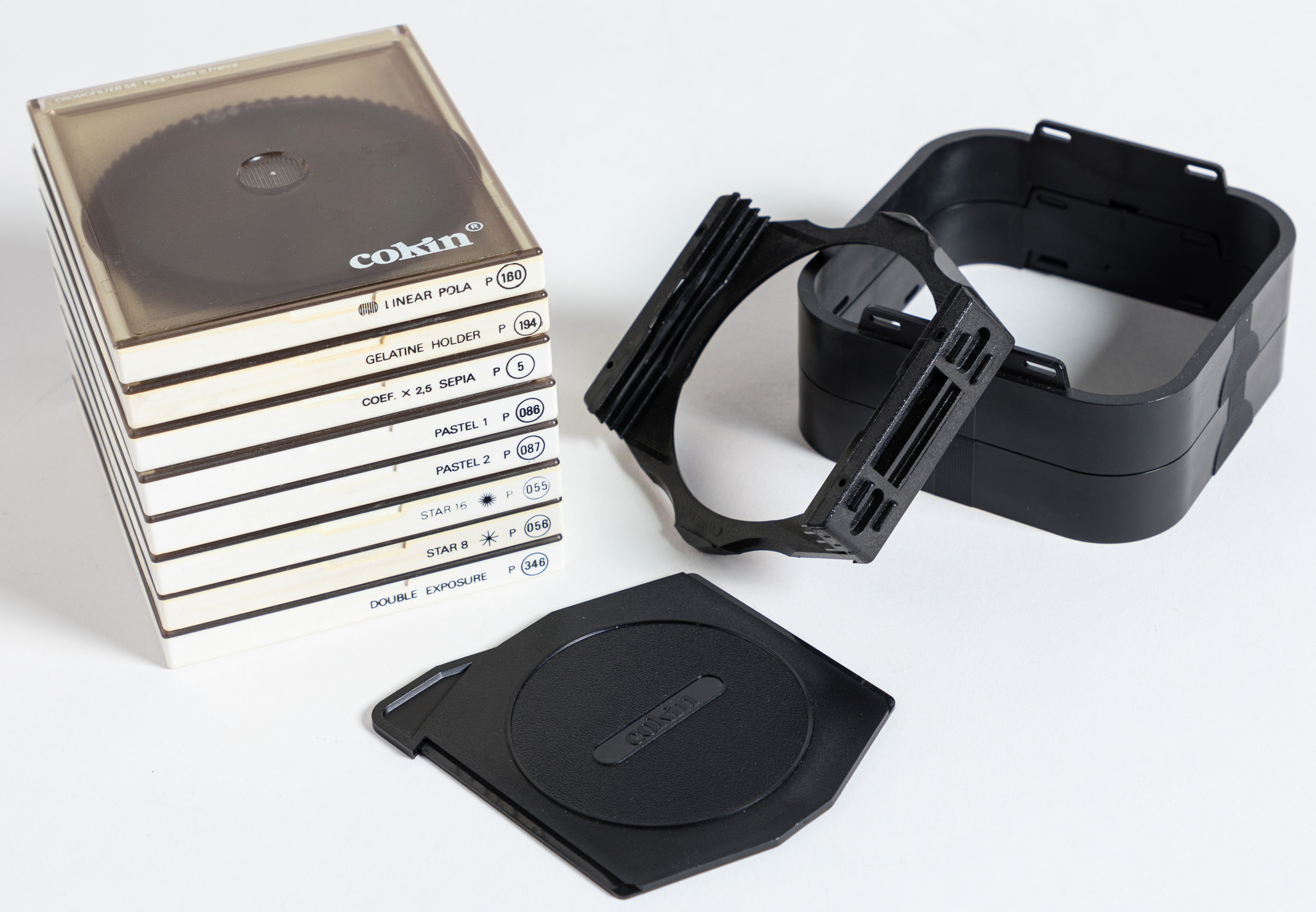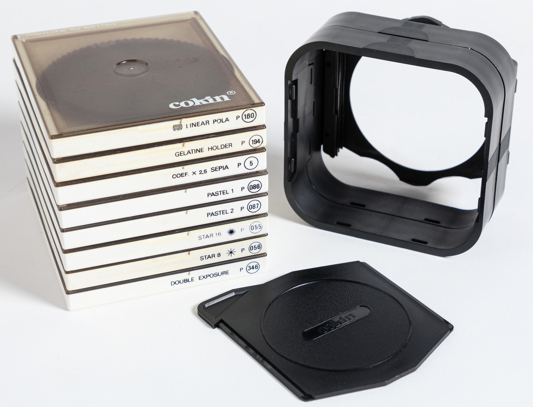 Original Cokin P Series filters: Linear Polarizer, Gelatine Holder, Sepia, Pastel 1, Pastel 2, Star 8, Star 16 and Double Exposure. All roughly 3.5” square (officially: holds Filters 84mm-Wide, 1.6mm-Thick), and designed to slide into the adapter which also mounts the lens shade parts. Also included: adapter ring, 2 lengths of lens hood and lens cap. Everything is modular, you can mount up to 3 filters in front of your lens, add on to the lens shade if you like. You will need an adapter ring to mount to your lens’ filter size - I have six of those rings ranging from 52mm - 77mm threads, $5 each.