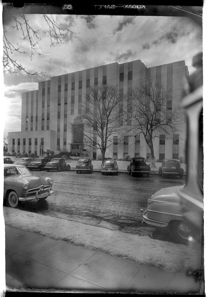 But I once bought a box of IR sheet film that must have been from the late 40s (it said "Develop by June 1950"), and it turned out to have a couple of exposed sheets in it. (I *think* they were undeveloped, but of course I didn't see them until I'd put them through development myself and they didn't have anything like the images I'd tried to shoot.) They were pretty decent, apparently shot with a Speed Graphic or something similar (you can see the bed in one shot); one is the courthouse in Vancouver, WA, and the other is a semi-rural landscape from somewhere in the Portland/Vancouver area. The rest of the box appears not to have been used---I developed a few additional sheets just to check, but they were blank.