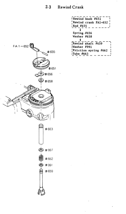 Andreas, wow, what a collection of stock you've got. That is fantastic. This weekend, I was out in the dark attempting to photograph rare fireflies when I accidentally unscrewed my rewind mechanism, at which point most of the parts sprang out and fell into the forest floor, where despite my efforts I could not find them. Reviewing this repair manual, I can see I need parts #652, 655, 656, and 997. Is there any chance you've got these on hand in a one of those F3s? If so, I'd be happy to pay you for them. Searching eBay I have only been able to find the parts 652/655/651 but not the rest.