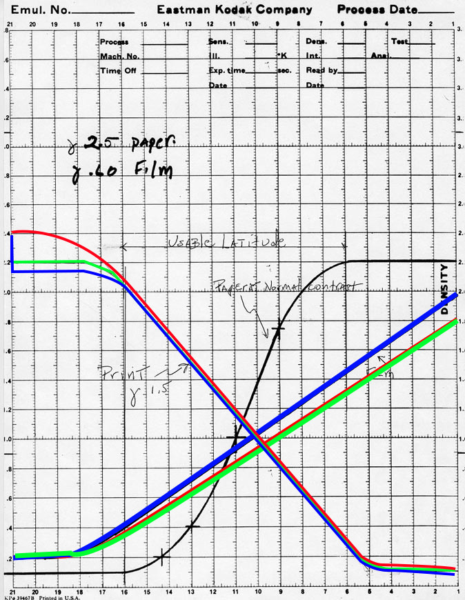My version is sort of a yet unresolved question, i.e the filtration/different speed points of the paper have removed the mask, by adjusting the curves of the film up or down relative to the paper, this should not modify the slopes of the film (at least without some other mechanism). Yet the paper at least (endura) does not have any such mismatched gamma to balance this out, it does have however have different maximum densities. What the final density of each the dyes in the final print is not yet known to me, so treat the line for the final result as an unknown.