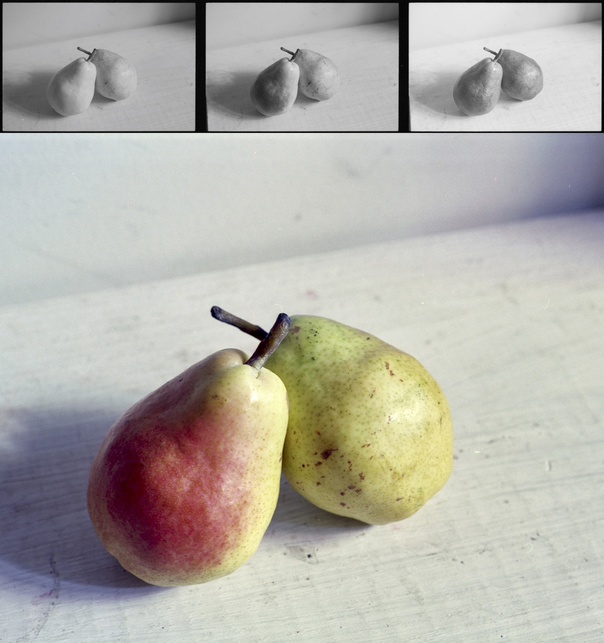 Wow, those are excellent first results! The reds and greens on the pears are spot on. Almost nothing that gives away that it's a trichrome, except maybe a hint of purple cast in the shadows.