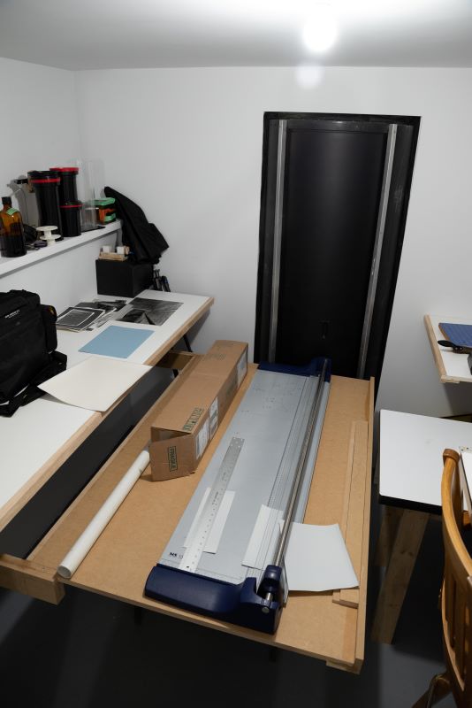 I have a few rolls of 20", 30" and 40" wide color paper in Kodak Endura and Fuji Maxima (in the freezer) that I cut down for use on a special built table. I do all of the cutting in the complete dark and can handle rolls up to 51 inches wide. Kinda takes up the dry area of my small basement darkroom, so I like to get all of my cutting done in a session and pack this setup away.