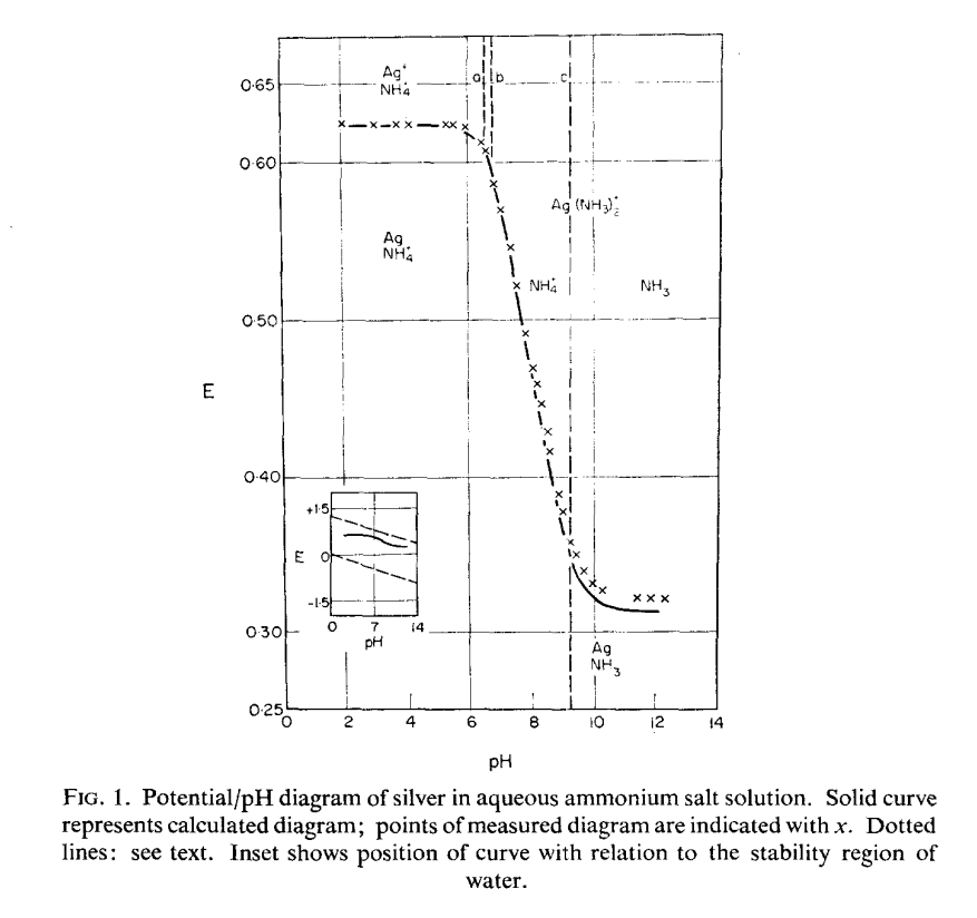 Since Ag+ has a different redox potential than Ag(NH3)2+, the shift from one species to the other can be easily seen in this chart.