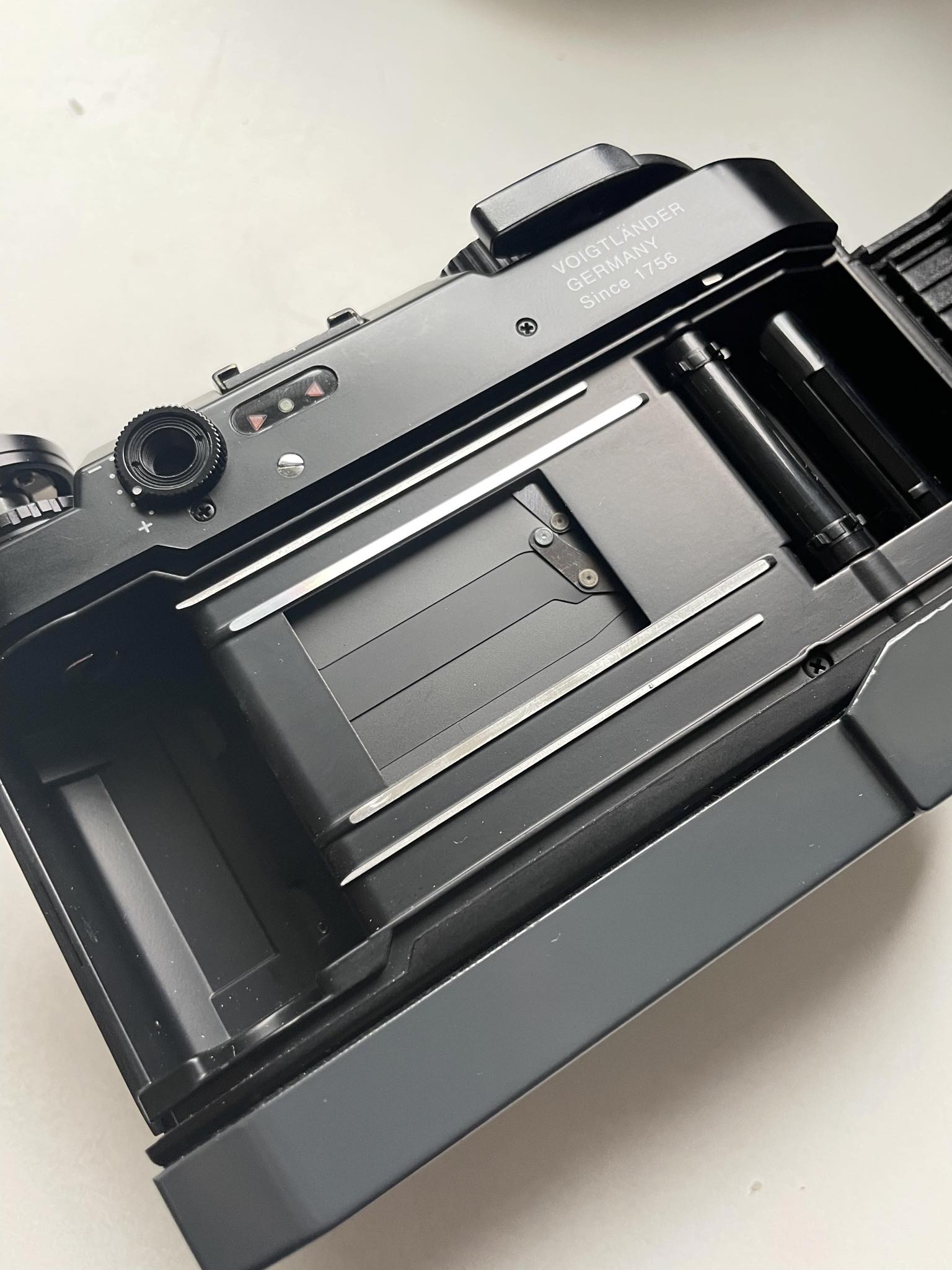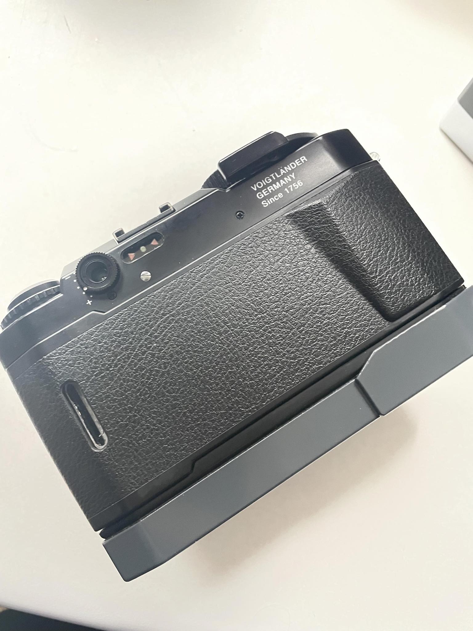 Voigtlander Bessa T with the Voigtlander rapid winder. Body is black and the winder dark gray with matching black accents. Looks great together. Meter works well and body and winder function very smoothly. Great condition.