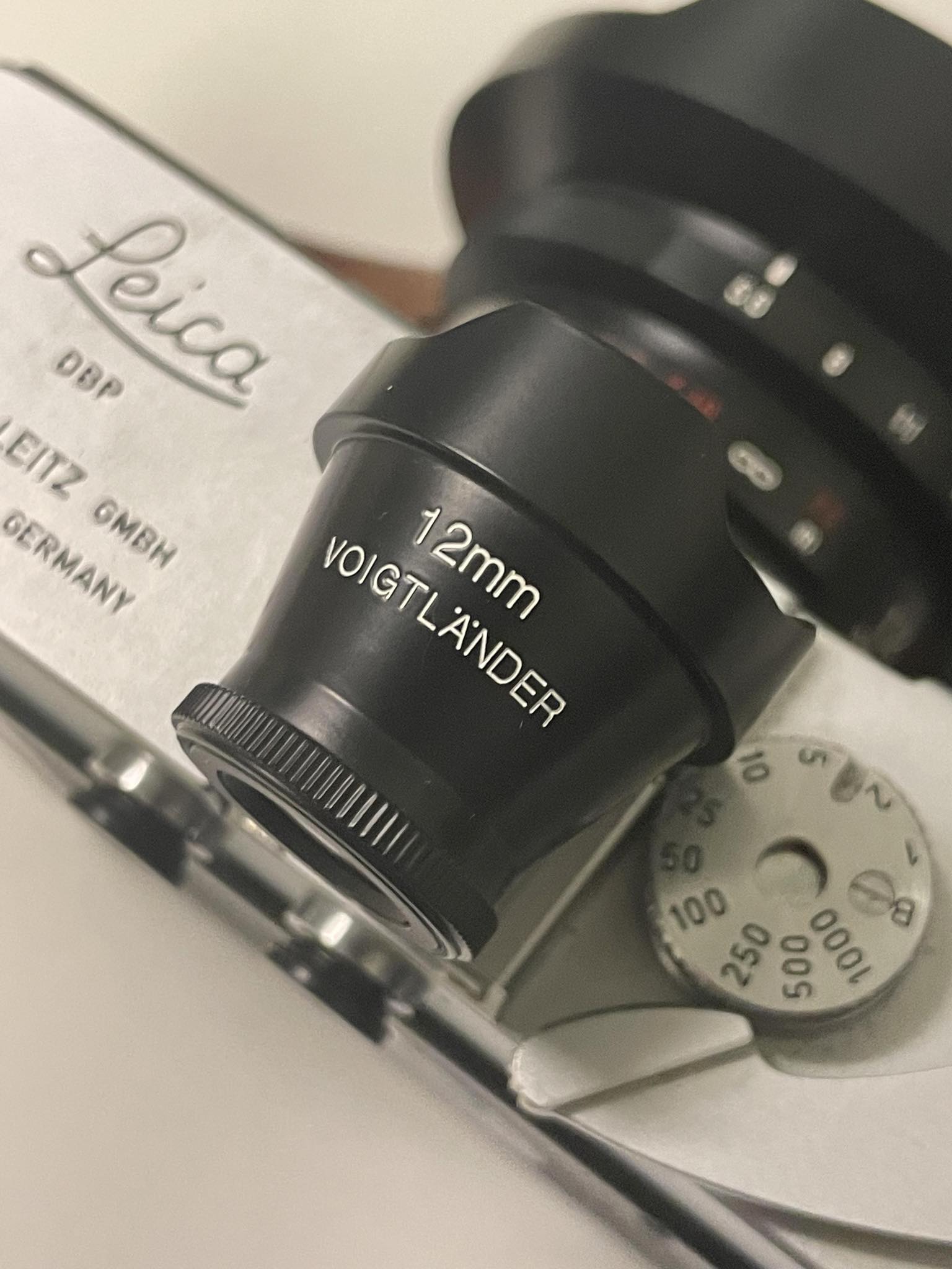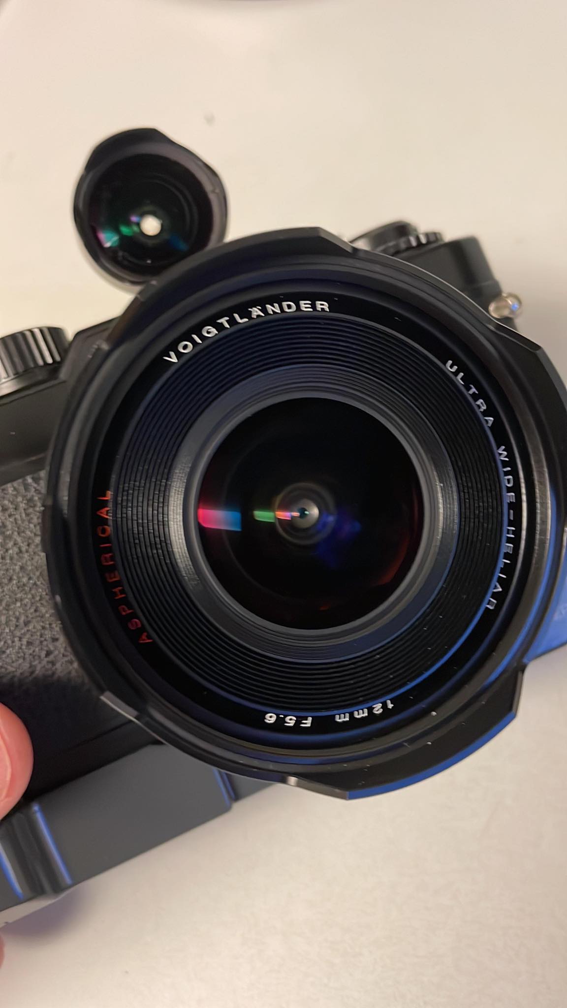 Voigtlander 12mm f/5.6 lens with the sought after metal bright lines Voigtlander 12mm viewfinder. This particular finder averages around $225 +/- by itself. Glass is great and lens works wonderfully. Viewfinder is bright and clear and has great framing lines.