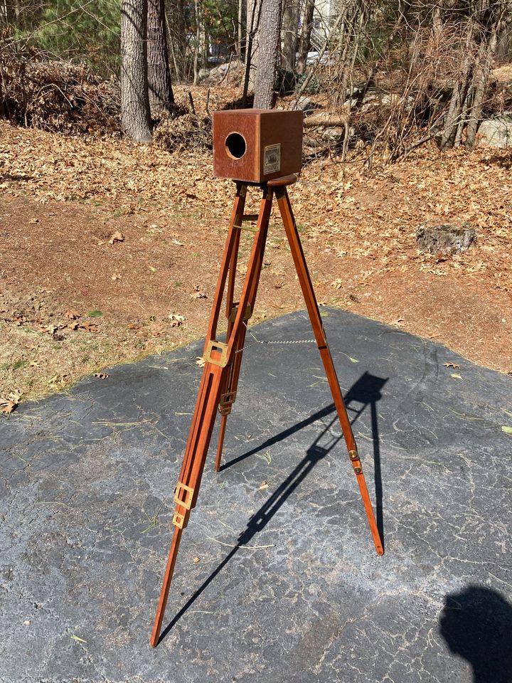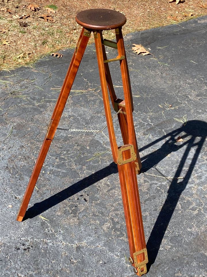 Awesome for display or actual period use. The No 4 was the largest size made, extends to 5.5 feet tall and has a 6.5" tripod top (head) . Image shows a 4x5 box camera on top, for scale (not included). Condition is a solid 9 - any white spots you see on tripod are from packing, Styrofoam "peanuts".