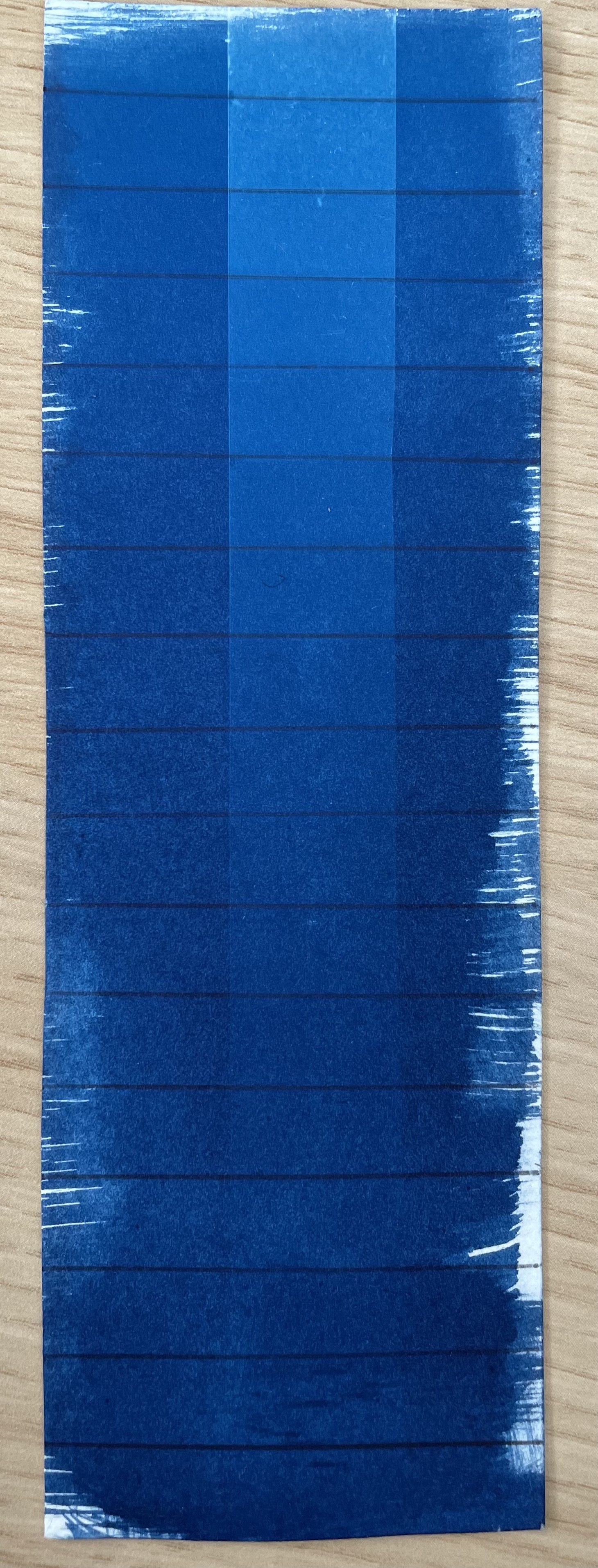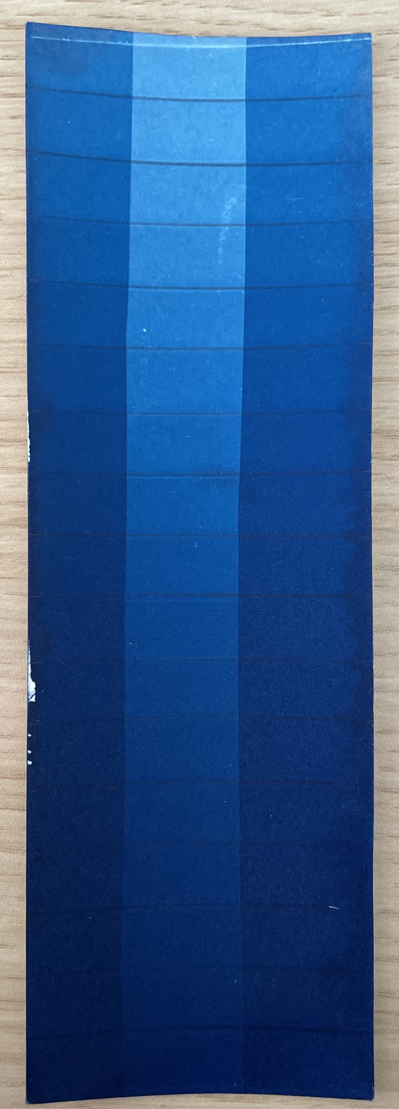 I am returning to cyanotypes (after a decade of not doing it), so I am re-calibrating my baseline exposure time by gradually exposing a test strip...