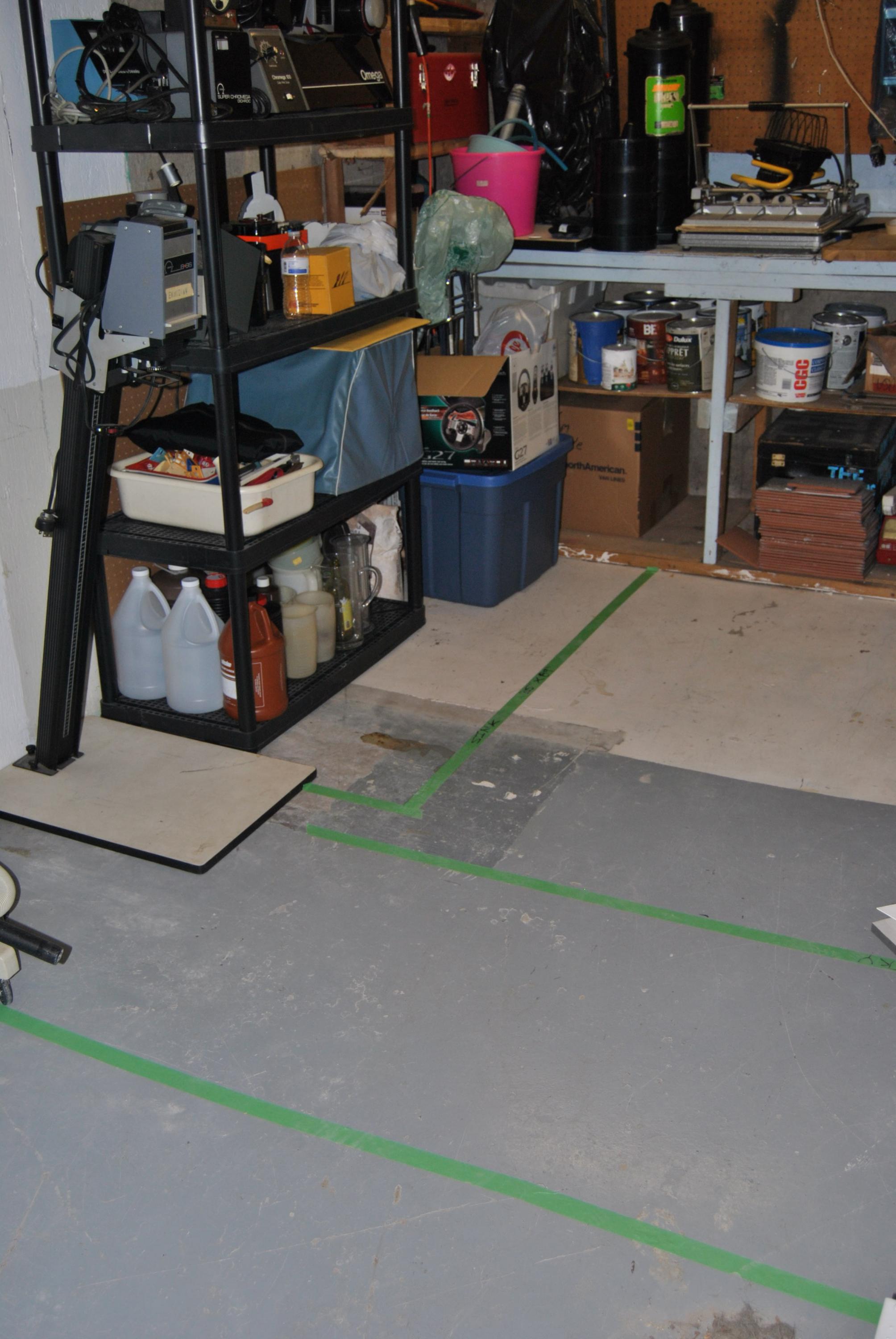 The line of tape under the shop vac will be my exterior wall. Next line is the out line to my dry counter. The line by the black shelve is my sink. I was also kicking around putting the sink on the new wall and moving my dry to the sink. making my dry a L shaped dry counter lead to the sink. The reason I have my door off the office is for space really as we have plans for the new wall to have shelves on them for my wife stuff. As she is losing a chunk of storage area in her laundry room. So one idea is to have the dry counter run from the counter were the paint can are to the enlarger on the floor. then across my new wall would be sink. leaving me some space beside the sink for storage and shelves. Also I have plans of converting the office/computer room into an extended work area for my. some where to mat and dry mount and maybe put my print dryers. I hope this explains my ideas and vision and I will look at your suggestions as well.