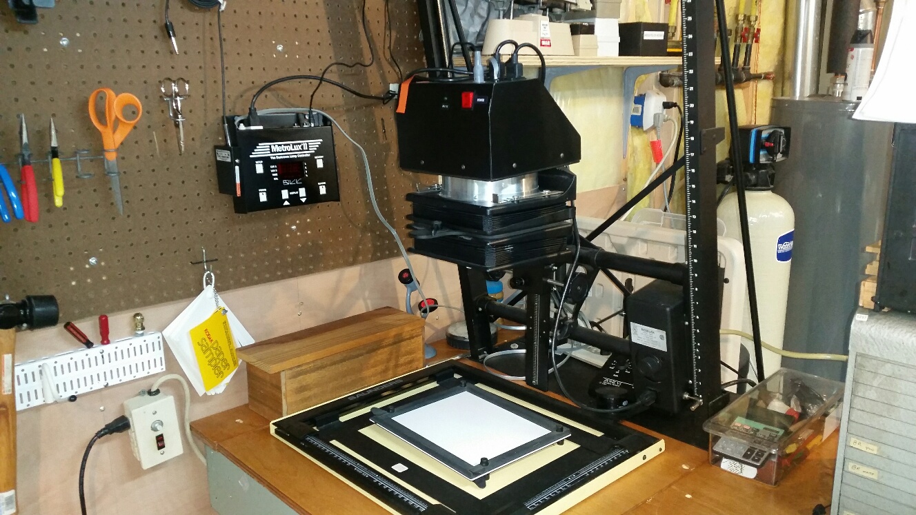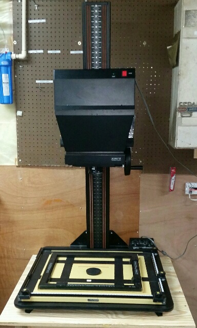 I got the LPL enlarger for free from one of the high schools here in town which has an incredible photography program. Since the film price jump a year or more ago, they've had to scale back on the film component, and so were getting rid of a bunch of equipment. I modified the column slightly to mount it to the ceiling so that the work surface underneath would be movable for doing bigger enlargements. It has only 2 positions, but they both have adjustible bolts so that it can be properly aligned with the enlarger.