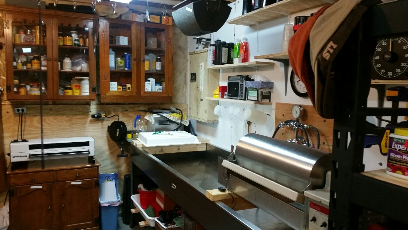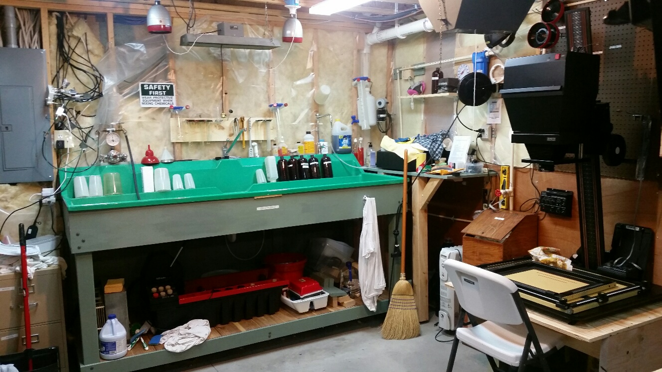 Here's my latest conglomeration. I need to get rid of every little thing I don't require in the Darkroom. I should have finished the walls first but I needed to get up and running. When I retire (Which isn't going to be much longer, I'm going to put up some more panels, etc. What a great lifelong hobby! Best Mike