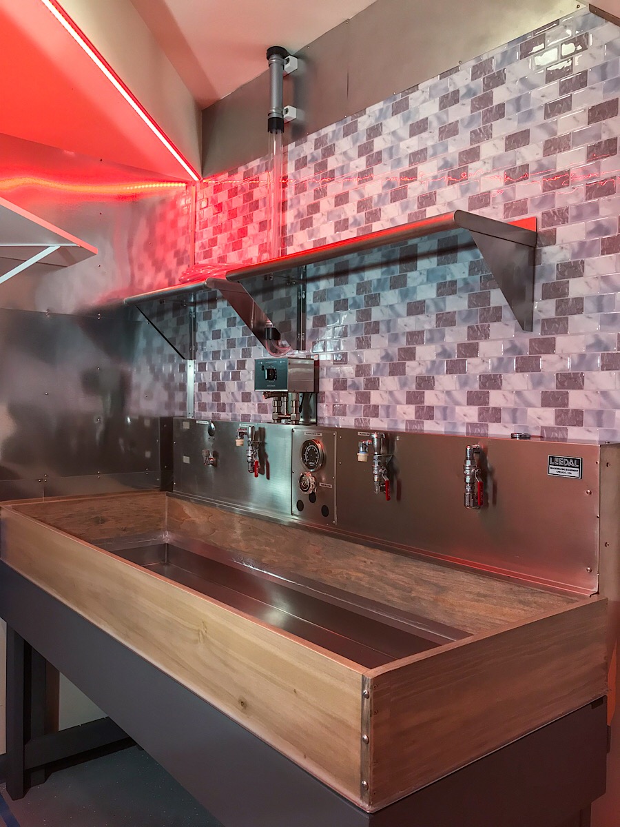 Here is one of two sinks placed in the wet side area. The sink is 6’ feet and was originally 4” deep but I took about a week to put an 8” extension on it to make it a deep utility sink. The tubing going up the center of the wall is for dedicated chemistry disposal lines, each with their own pump to send spent chemistry to holding tanks in the garage above. Developers and stop bath will be one line and fixer the other.