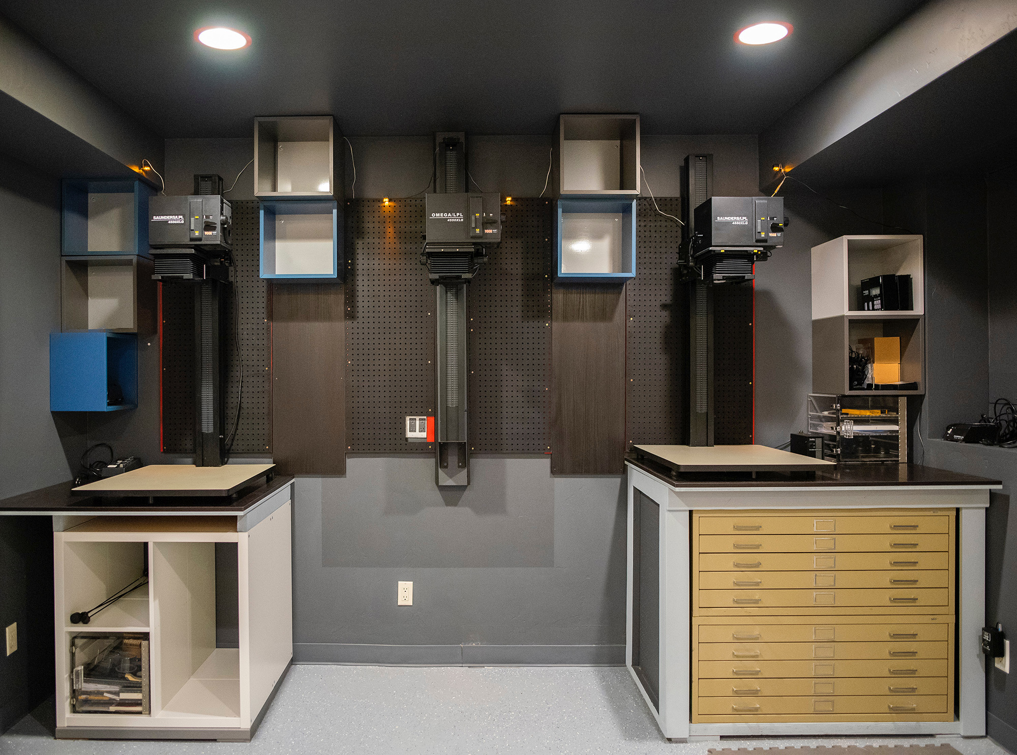The setup will be three LPL 4550 XLG / VCCE enlargers, two on either side baseboard mounted for up to 20x24 and the one in the center wall mounted to achieve 40x50 at the floor.