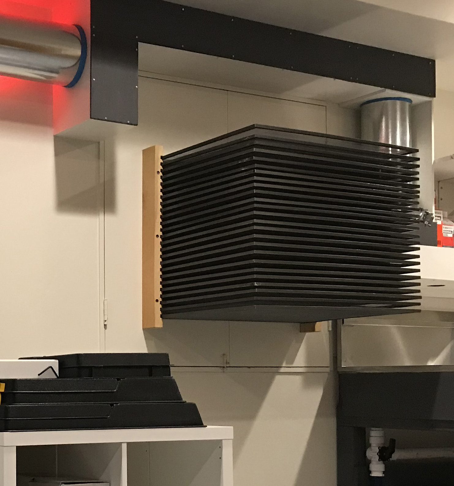 So just to re-cap, the room is roughly 13' x 35' feet with the ceiling height just below 9' feet and is in a finished basement of my home. Two of three Saunders LPL4550XLG enlargers are up and running, the center one which is wall mounted needs to have it's mobile / rolling work table designed and constructed. Then later the wall mounted LPL will have a floor easel made so I can print up to about 40" x 50". The egress is still in place but also serves as an exit for my exhaust which is hidden as a shelf directly above the 9' foot sink. The egress window stays closed until the ventilation is needed and is opened via an access cover to allow the exhaust fan to work, regardless of mode it is totally light tight and the egress access panel is quick to remove. Positive pressure air is delivered via a Doran 12"x24" louver vent on the darkroom door, ventilation in this space is excellent. The space is now fully plumbed and drains via a 1/3HP sump pump. In addition to the 9' foot sink, there is a 6' foot one that is 12" inches deep for processing film and other tasks. There is also a small utility sink for the Jobo CPP3 with it's own drain and dedicated cold water line for the cold water solenoid on the processor. The 6' and 9' foot sinks have T-valves on the drain to both capture water for re-use and chemistry from the larger trays. I am big on water conservation and the myriad of pumps and drains have made it a lot easier to accomplish this. The 16x20" and 20x24" print washers are also on re-circulator pumps to cut water usage. Since I am on a septic system, no chemistry is poured down the drain and is instead dumped into a vat and pump system that sends it to holding tanks in the garage above grade, another reason each sink has a diverter valve.