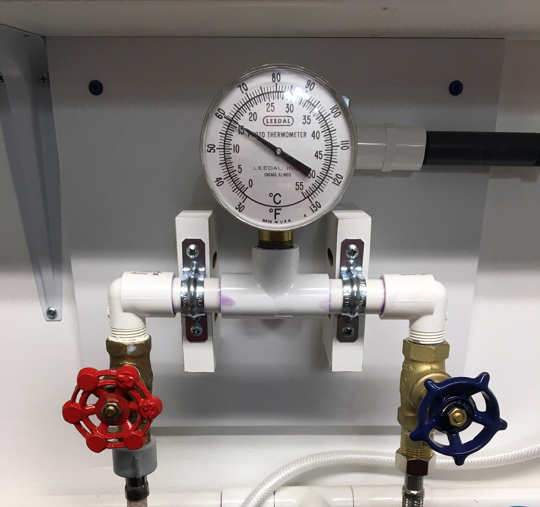 This made me think of a recommendation to darkroom designers and builders. Put the plumbing for the sink where you can get to it, in case you want to modify it later. The plumbing for my darkroom sink is hidden behind the "splash-guard" part of the sink and is a real hassle to get to.. I don't often need to temper my wash water but if I did, this would be a good way to do it..........Regards!I finally finished a simple water mixer panel for my darkroom. No thermostat or electronically controlled temperature, just separate valves for the hot and cold and a thermometer to monitor the mix. This is not the first darkroom I've had with hot and cold water, but prior to this, I've always just had a run-of-the-mill kitchen faucet for the hot water (and the mix) and cold only in any other faucets. That was the case here until the water got really too cold to do a good wash over this past winter. Of course, it’s almost Spring and the really cold water has abated somewhat, but I’ll be ready for next year. Only had one leak when I first hooked it all up, but that was quickly resolved. The mixer feeds all of the faucets in the darkroom across both sinks!