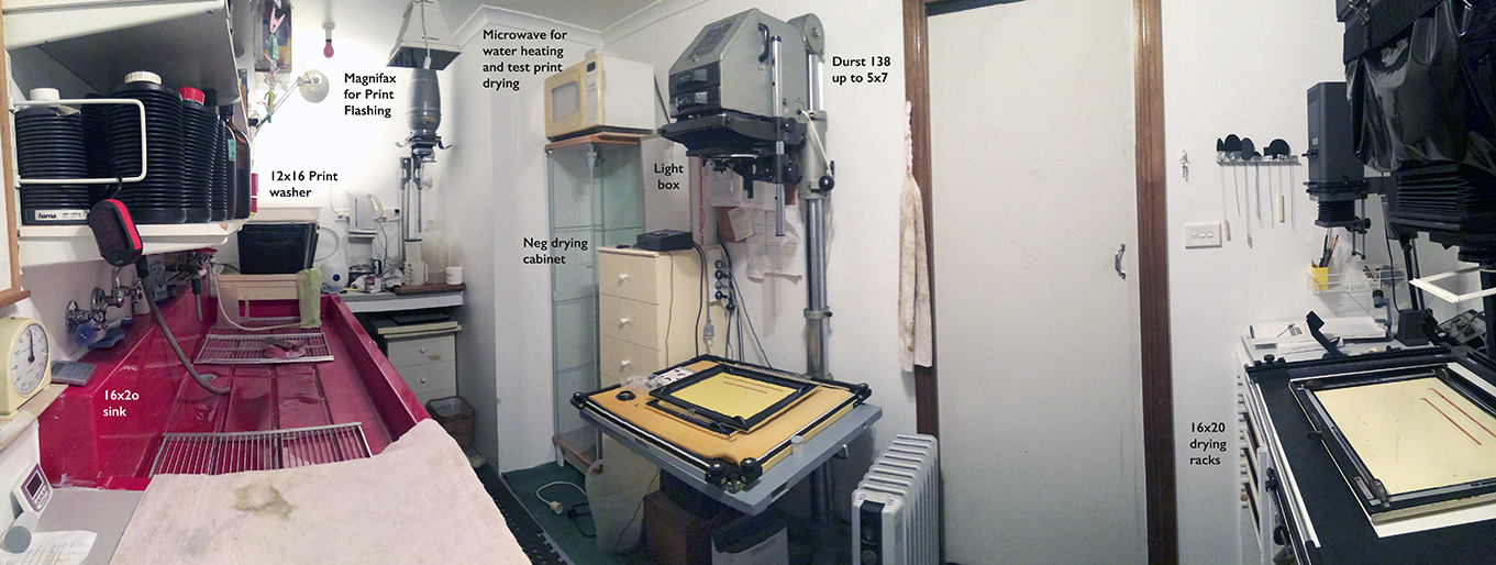 So far I am loving the workspace including the 15' foot or so distance of enlargers from wet side, never been a fan of the risk of having things splash from the sink area to the enlarger area and like the aspect of walking across the room during long print sessions. There is still a ton to do, final wire harnessing, shelving, removing the 2"x4" assembly joist from the 9' foot sink to gain 8" of storage underneath, table / cart underneath drying screens, mural components, etc. I figure another year for that. In the final analysis there is more space to work than I thought there would be which will be great for the larger prints down the road.