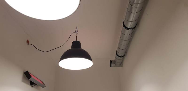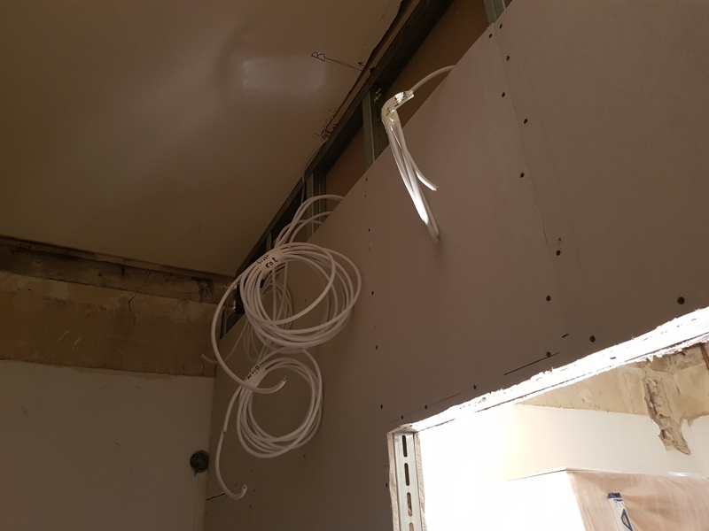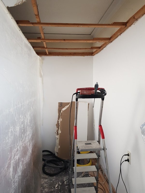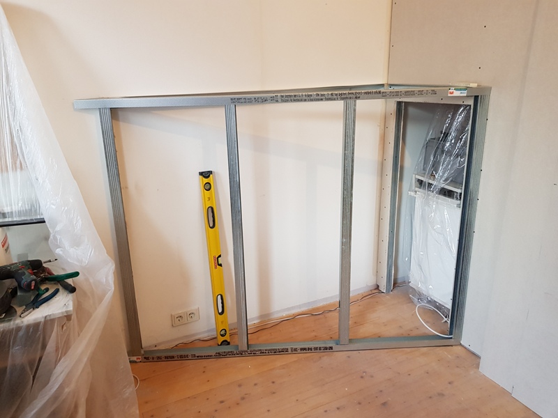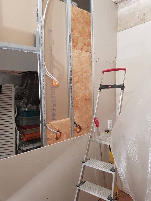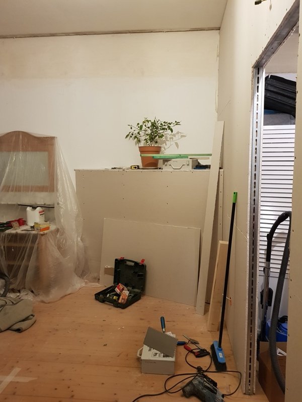First practical steps were removing the old suspended ceiling and building the drywall construction including wiring, pastering walls etc..