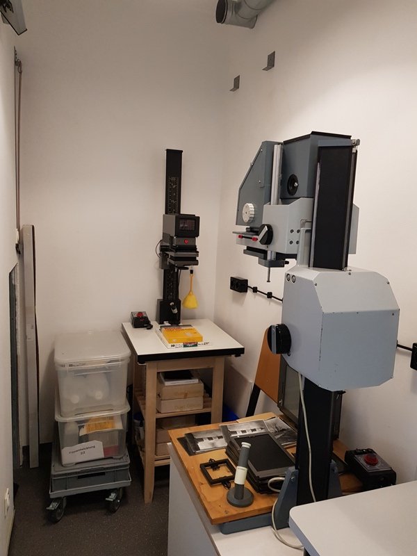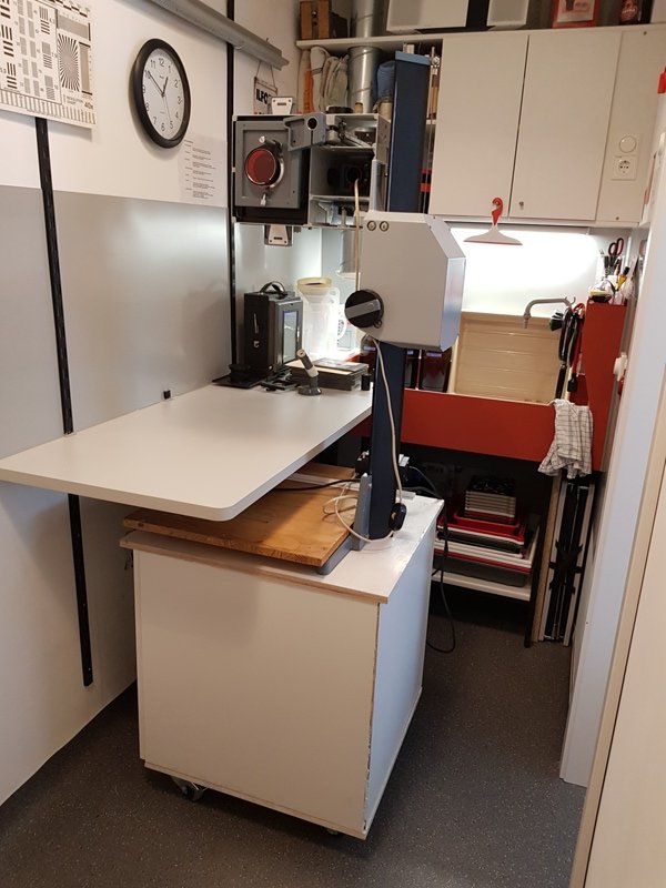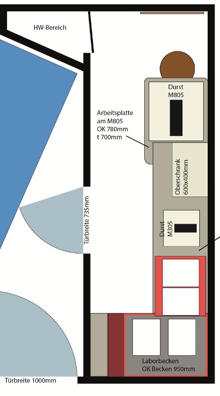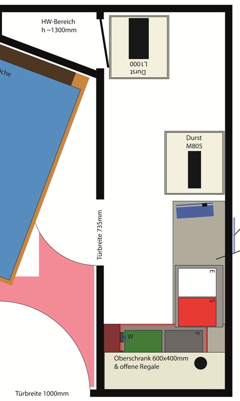 The original plan showed mostly benches, but I decided for more flexibility with only a minimum permanent workbench and all boxes, enlargers, workspaces on wheels for a maximum of flexibility.