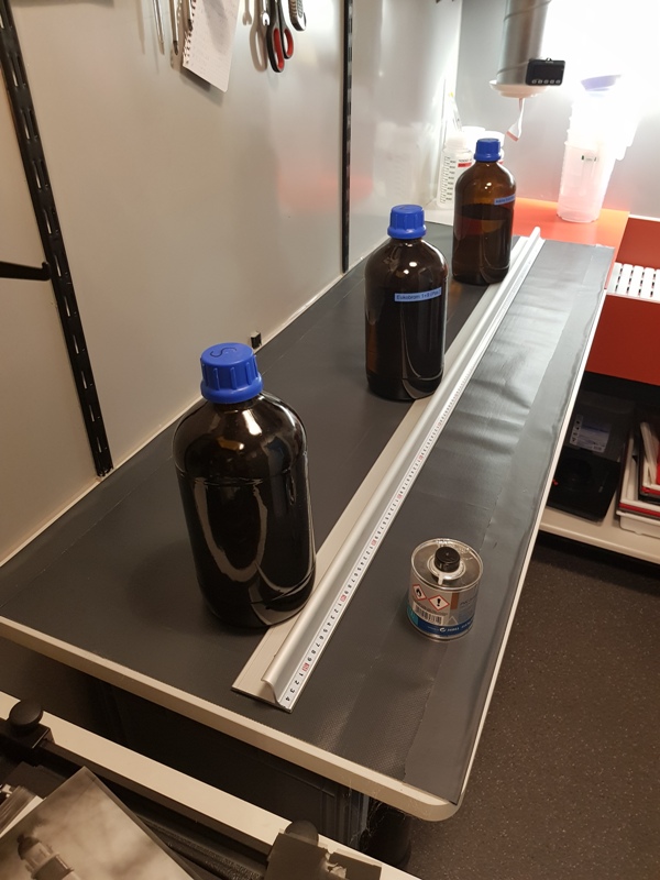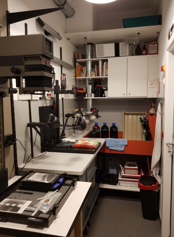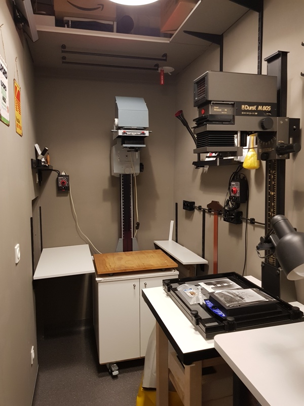 The gap between enlarging bench cabinets is where the UV light source will be going, with a heavy sheet of glass on a slide out shelf for contact printing.