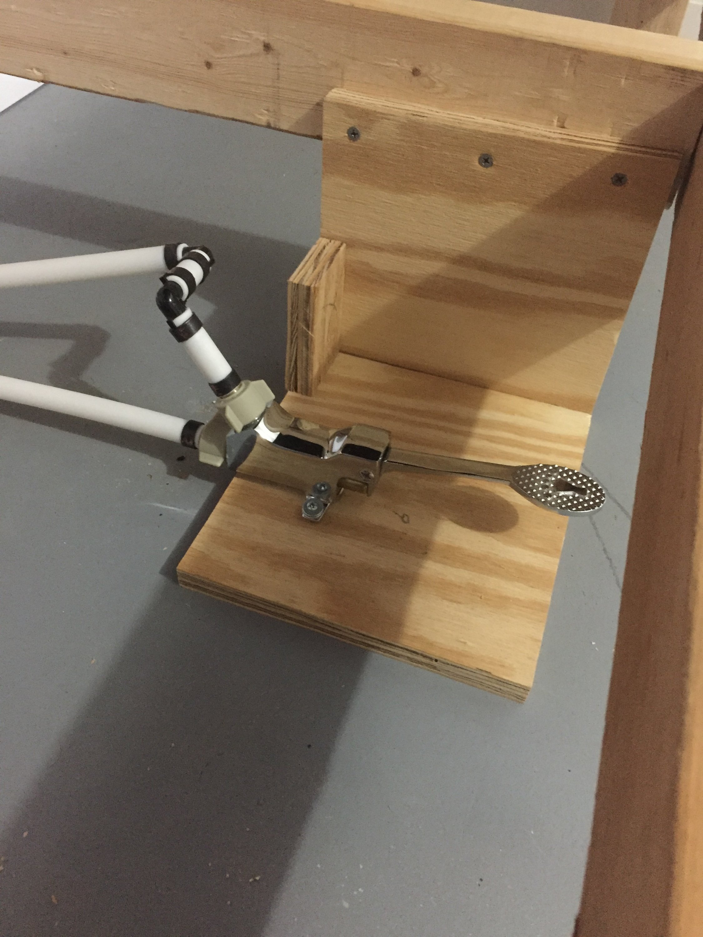OK, final update for this weekend; fabricated a mount for my foot-pedal water valve that will dispense tempered water to the sink and cut/installed and put the first coat of paint on the bottom shelves for both the sink and the enlarger table. Talk about over-engineered; 18mm (23/32 in.) plywood and a bucket full of drywall screws. I could park a tank on the enlarger bench and it wouldn't blink! As long as I don't have Earth tremors, I should have a stable enlarging platform...