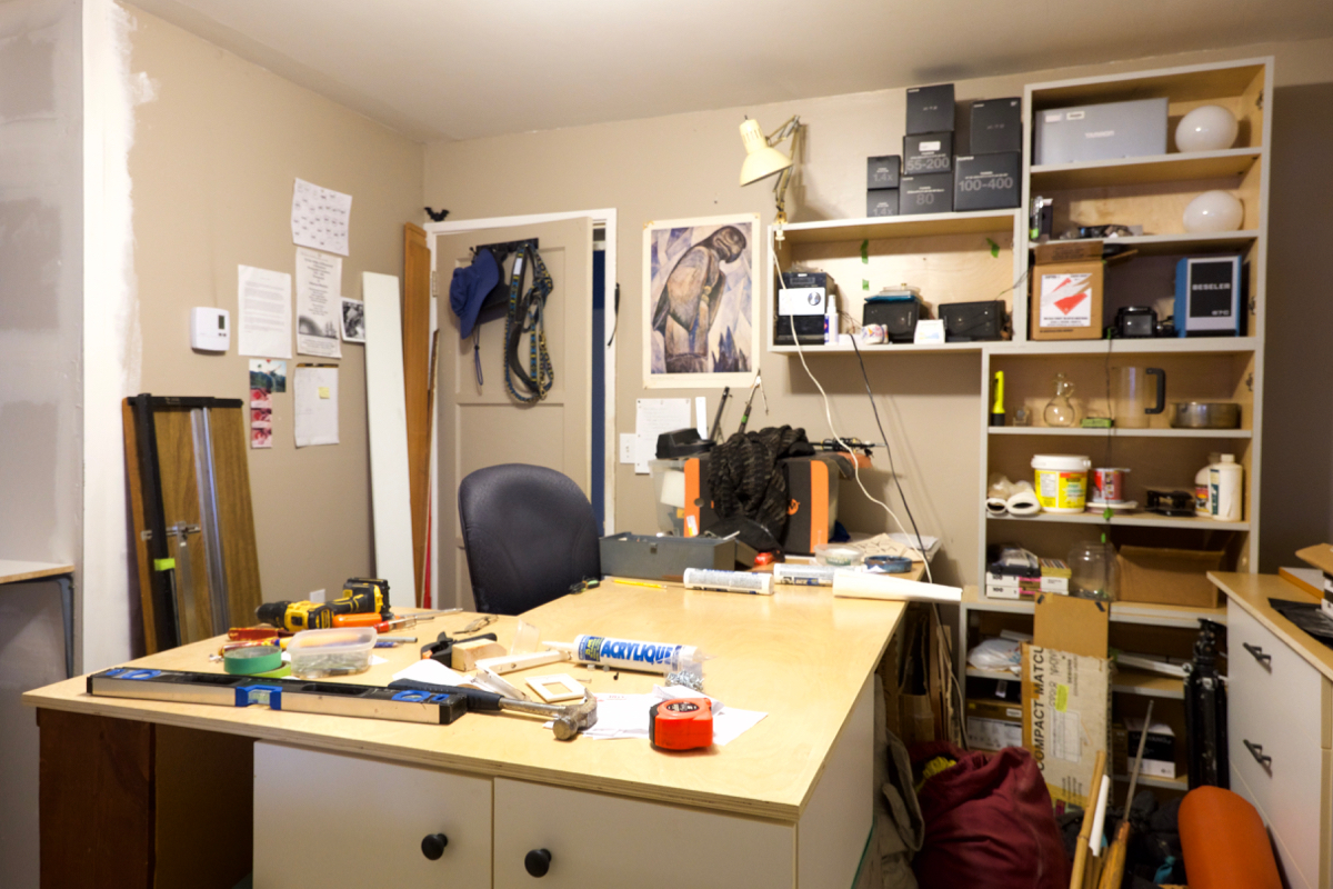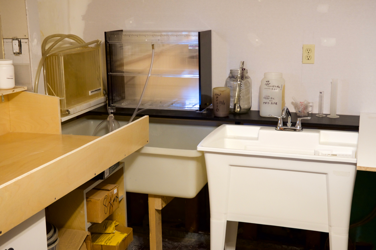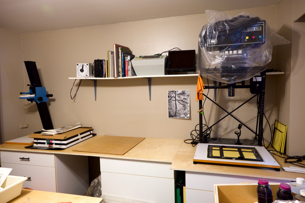 The gap between enlarging bench cabinets is where the UV light source will be going, with a heavy sheet of glass on a slide out shelf for contact printing.