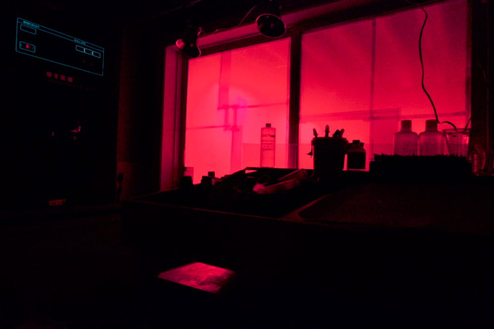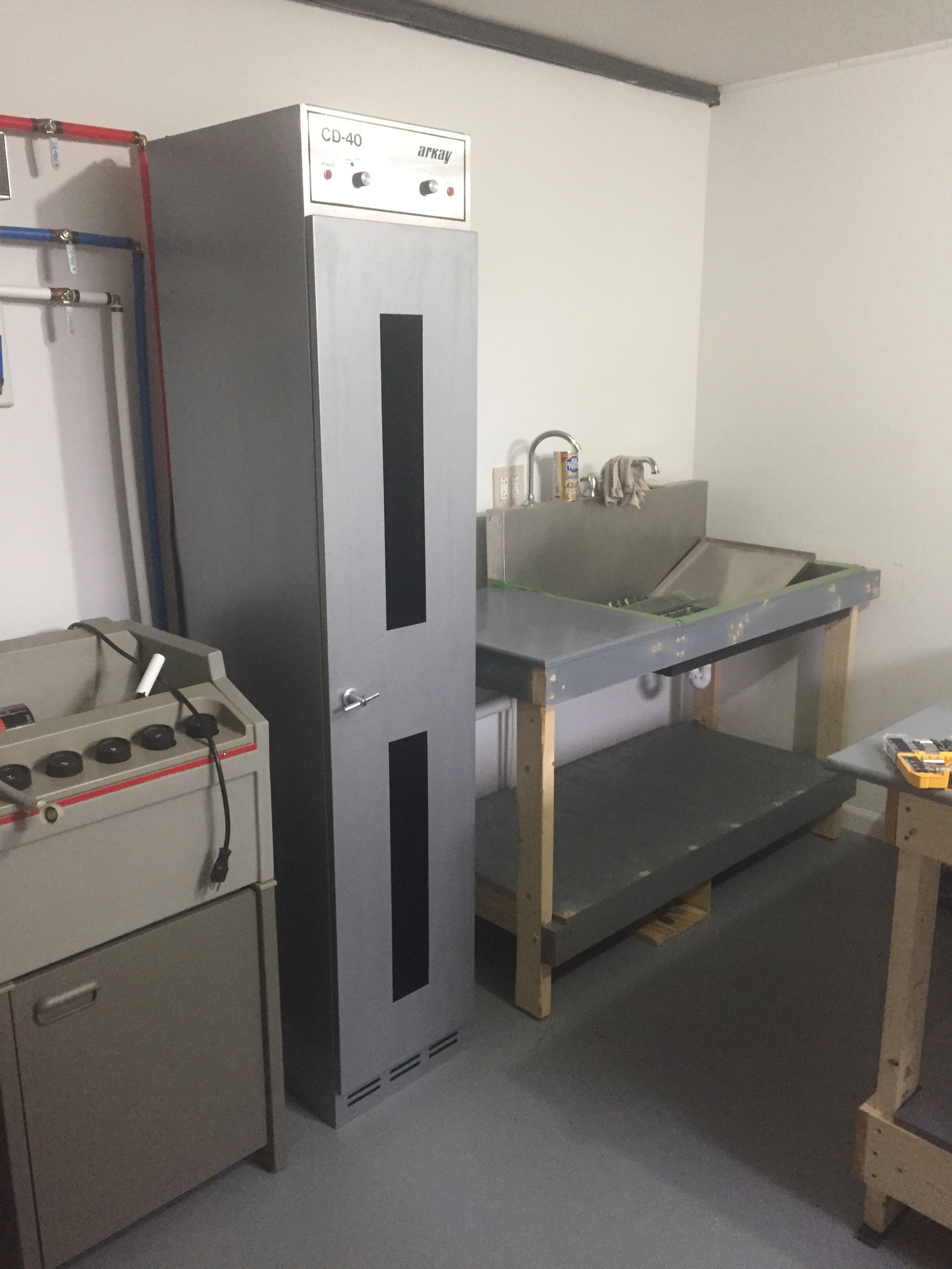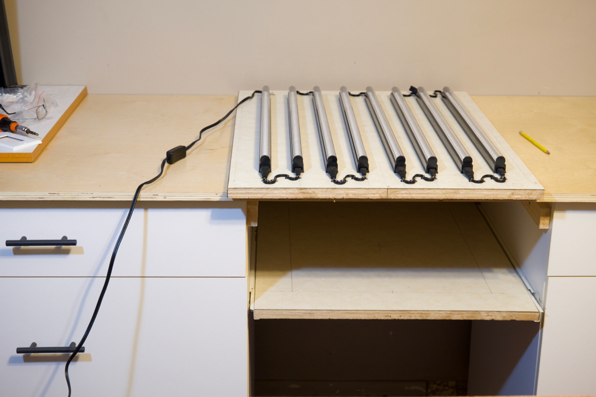 Under the counter UV LED light source in place with a pull out drawer for heavy sheet of 16x20 glass contact printing rig.