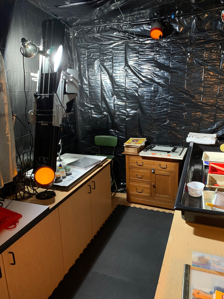 My darkroom, completed this spring after 13 years of waiting. Walls are a double layer of black landscape plastic, power is by extension cord, water by buckets and jugs. Door is a light maze. All the equipment and furniture were free.