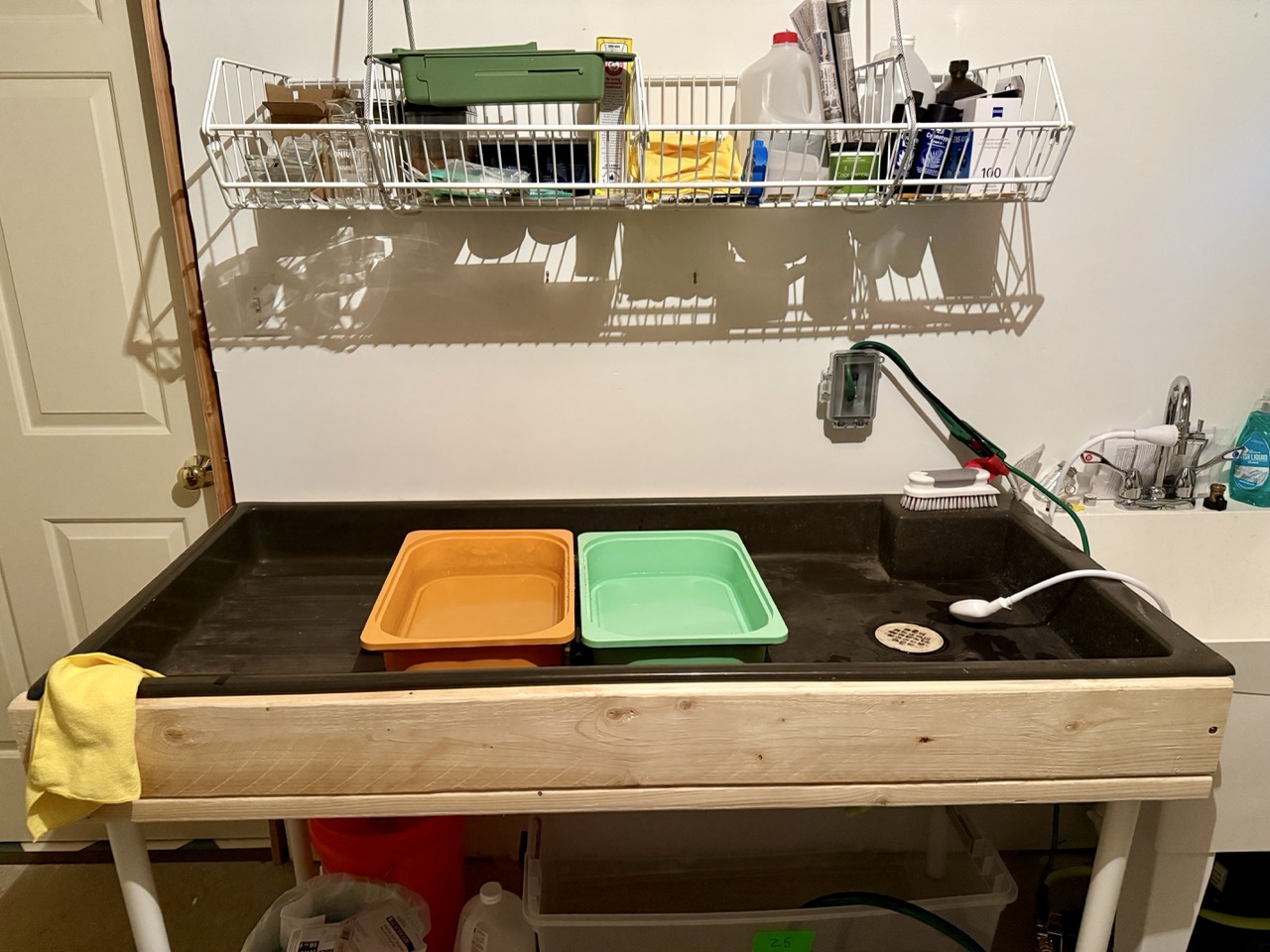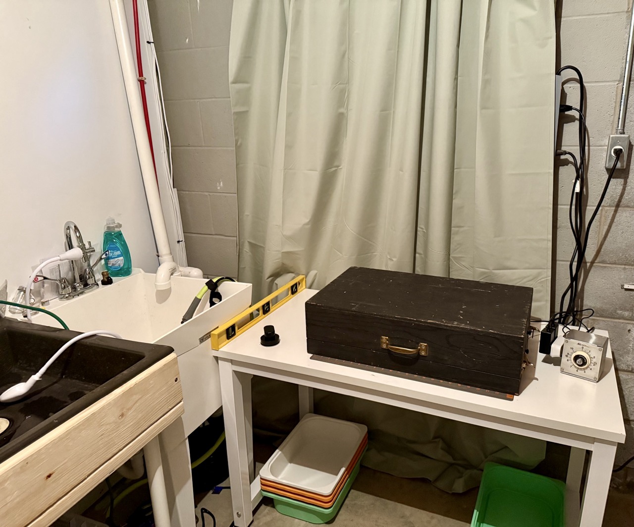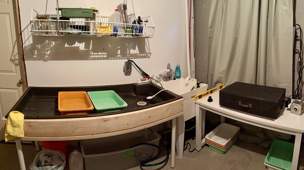 The low-budget, alt-process "dimroom" corner of my basement. The most expensive bits (by far) were the parts that went into the UV box (the black box with the handle). The darkroom sink was $25 locally, the timer was $5 at a Goodwill, the bins are from IKEA ($3/each I think?), and the wire basket shelf was $10 at a closing Joann Fabrics. I'm very pleased with how it turned out.