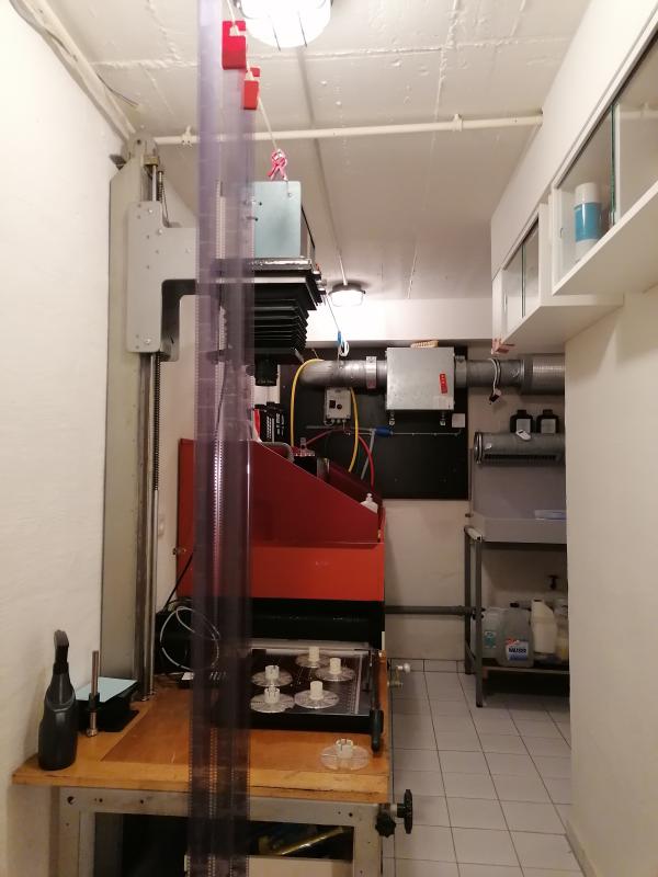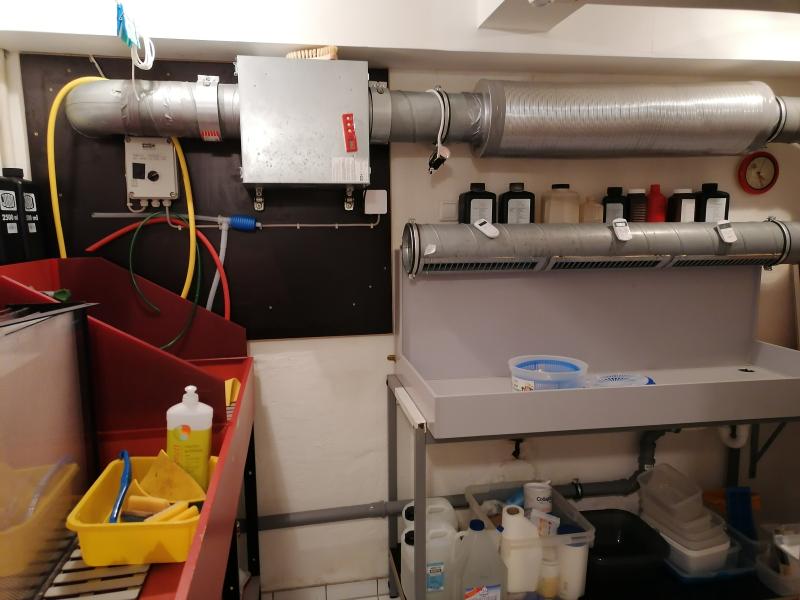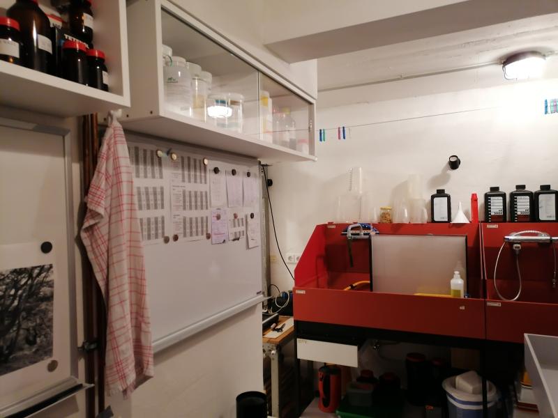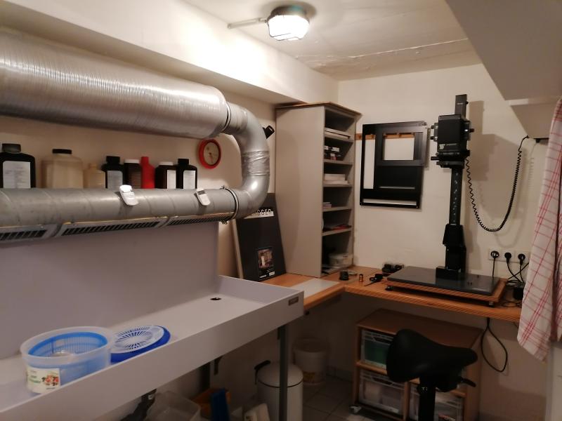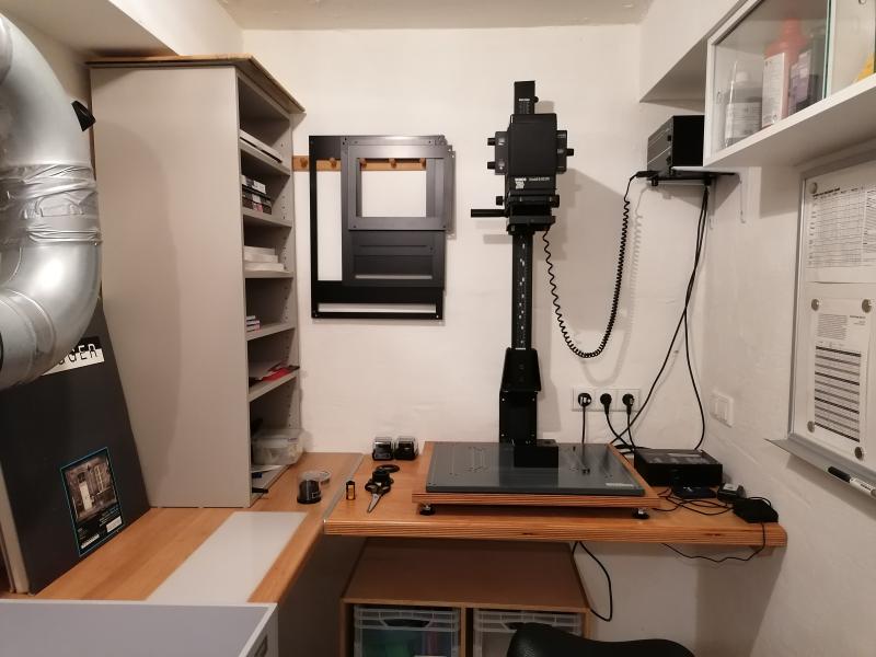 I'd like to show you a tour to my little darkroom. As you my notice the room is L-shaped and located in the basement. I had shown it in the old thread already but this is the latest incarnation. It features hanging cupboards with sliding glass doors for storing of chemicals an other stuff. I hate dust in the darkroom so I try to avoid to have stuff standing around as much as possible.