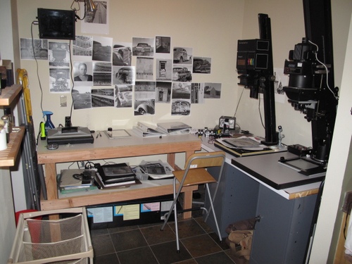 So, here are a couple photos of my humble darkroom. It's not everything I'd like it to be, but I can manage to make prints to 11x14 and hopefully 16x20 soon. I tend to pin 8x10 workprints to the wall (suggestion from Mike Johnston; TOP) as a means of "editing" and it seems to work out well. He said that if you still like it after a few days of looking at it on the wall, there's a good chance it can hold up as a portfolio, or series selection later. Anyway...I've really enjoyed looking over this huge thread and seeing the many MANY different iterations of the traditional darkroom.