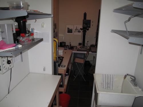 I'd love to post a few photos of my darkroom, but it seems I must have them available online with a URL in order to do that. (I ain't got not website for that so...oh well) I live in a downtown loft that had a large closet/laundry/bathroom arrangement and my loving wife elected to cede this space over to me for a darkroom last Christmas. It isn't ideal; I wish I had room for a proper sink, but the space works out allright for me for now.