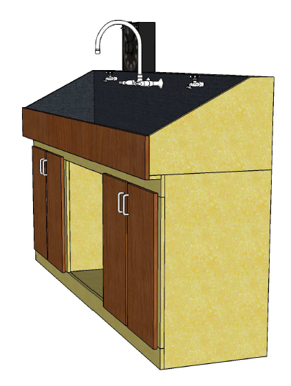 First, add a kick space at the bottom of the cabinets for your toes (like kitchen cabs have). You'll be thankful for that extra space. I added an extra thickness to the front splash of my sink (so it's 1 1/2" total) and then rounded the top for comfort. I'd recommend something like that so you don't have edges digging into your forearms. Do slant the bottom of the sink so it drains well. Mine has a drain in the middle back so I slanted down from both sides and the front; placing the drain in the middle kept me from having a large elevation difference from on side to the other. If you have timers with footswitches, make allowance for the wires early on; it's a pain drilling holes in the already-installed sink for them later.