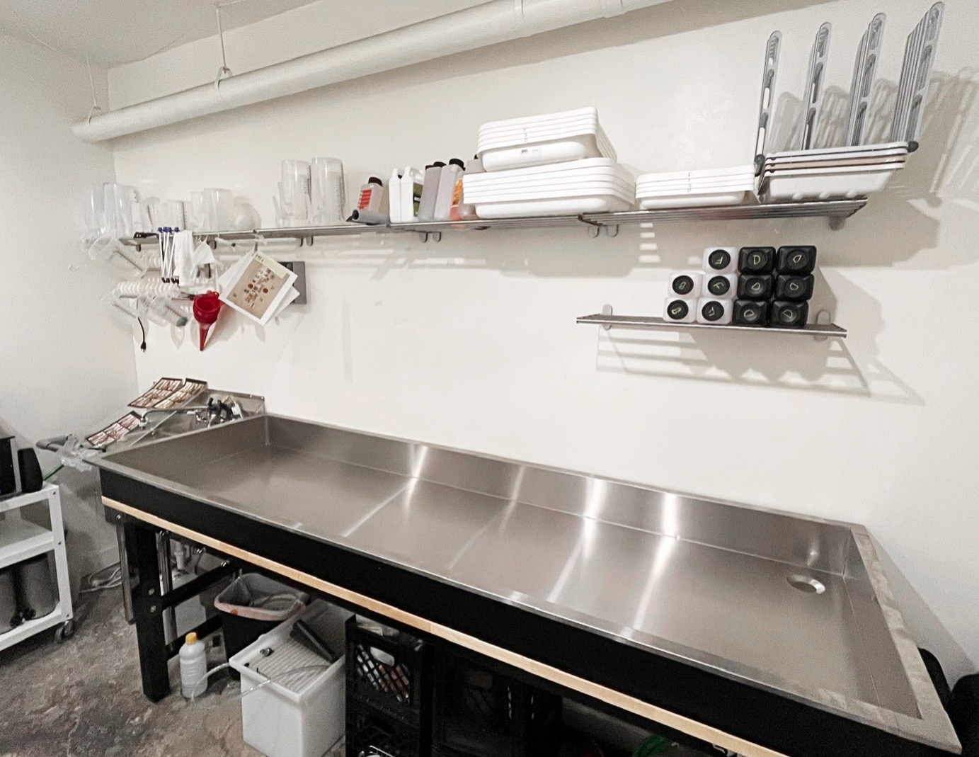 I‘ve been fortunate enough to find a small affordable art studio that I’m converting to a darkroom with free permission to do just about anything I need. The space has a small slop sink which is great, but I’ve opted to install a 30”x96” stainless steel sink next to it. Most days will be 8x10 prints but I do have plans for some larger 16x20” print runs and the occasional 20x24” piece.