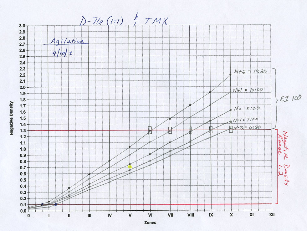 When I get the low zone separations I want, I then check zVI and VII; if these are off, I check to see whether everything else is where it ought to be; if it isn't, I look again at my EI, not just my developing time. It is very important to pin that base correctly, and adjust the developing time to give me the slope I want. It may be that the combination that gives me what I'm looking for will include a useful zI, or it may not. I've decided for myself that it doesn't matter. I will change the EI, do another test, making whatever adjustment is necessary. Having done this for some 45 years now, I can save time by just moving my curve this way or that way, but I'd suggest that you actually do the test as many times as needed. Practice; no substitute for it! You are training your eye.