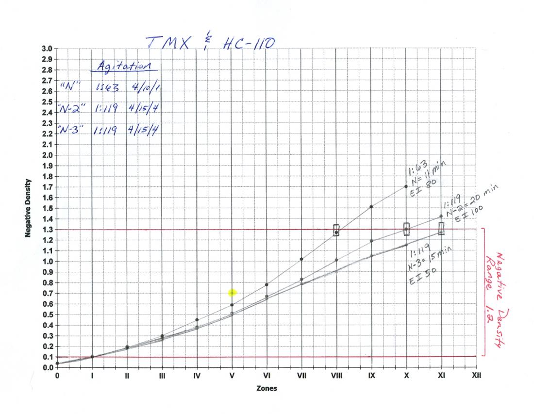 A change in developer could change the curve shape with regard to the middle zones, and that is where you will have the better control over the middle zones. A change in dilution and development process can also affect the middle zones. See the TMX & HC-110 curves----they are all upswept curves with this particular film/dev combo, especially the normal curve, but not until I used the highly dilute HC-110 with an increase in dev time and altering the agitation sequence, did the upsweptness of the curve somewhat flatten out to achieve the compensating affect. A sequence of 4/15/4 indicates 4 inversions in 15 seconds every 4th minute.