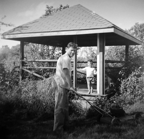 Fifties Dad mowing the lawn with son looking on (crop) by Harry Pulley, on Flickr