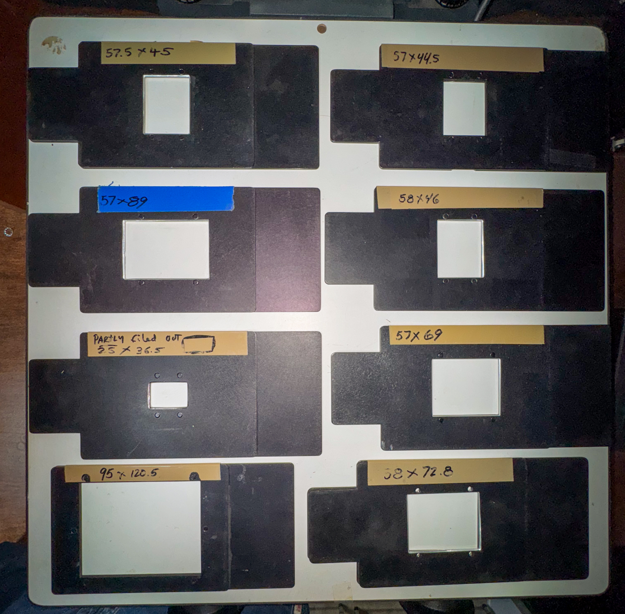 SpeedCarrier negative cassette system has been installed. The head does not lift open/close - the brackets which allow for this action are not present and the head is bolted firmly in place - this was done by the original owner who ran a large commercial lab here in the Washington, DC area). The lift handle and cpins are still there - so nothing should stop the next owner from returning the enlarger to its original configuration. Since it was only using the SpeedCarrier system, it was better to have everything locked down. Dimensions for the eight carriers (given in CM) are as follows; 57.5x45, 57x89, 23x36.5 (filed out), 95x120, 57x44.5, 58x46, 57x69, 58x72.8.